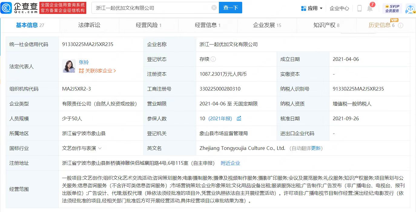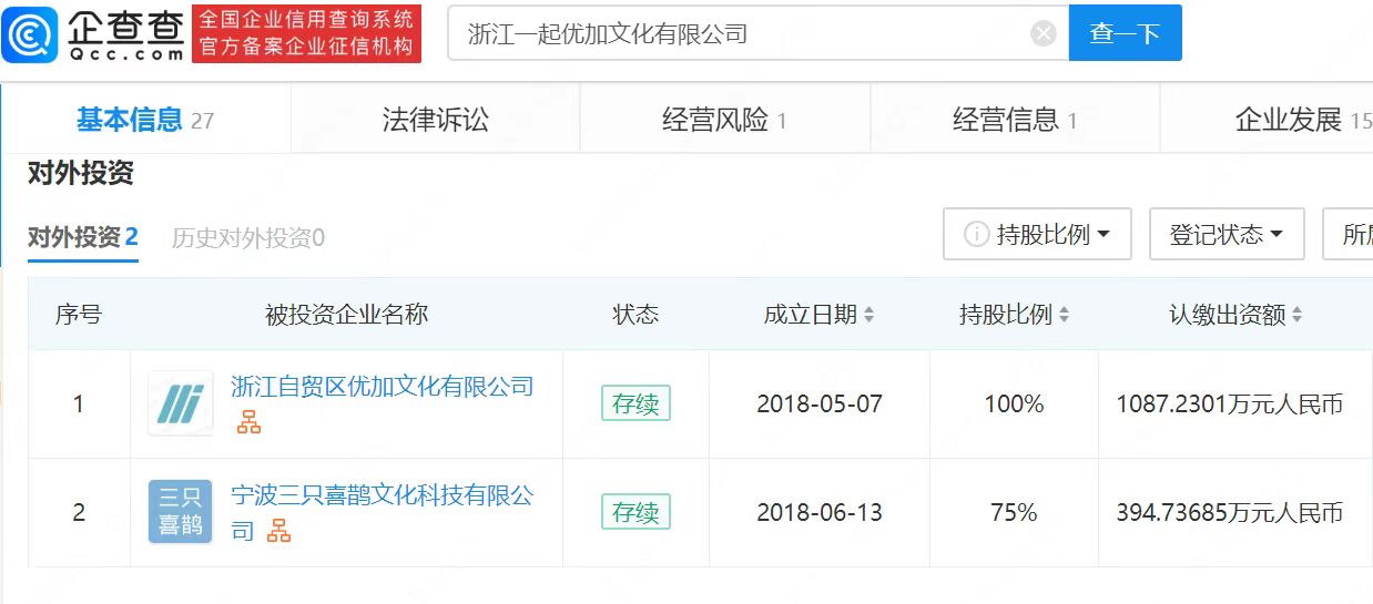 近日,刘些宁与jellyfish终止合约引发关注。据悉,刘些宁为“一起娱乐”旗下签约艺人,企查查APP显示,一起娱乐关联公司为浙江一起优加文化有限公司,成立于2021年4月,注册资本1087万元,法定代表人为张铃,经营范围包含广播电视节目制作经营;演出经纪;电影发行等。对外投资有浙江自贸区优加文化有限公司、宁波三只喜鹊文化科技有限公司。