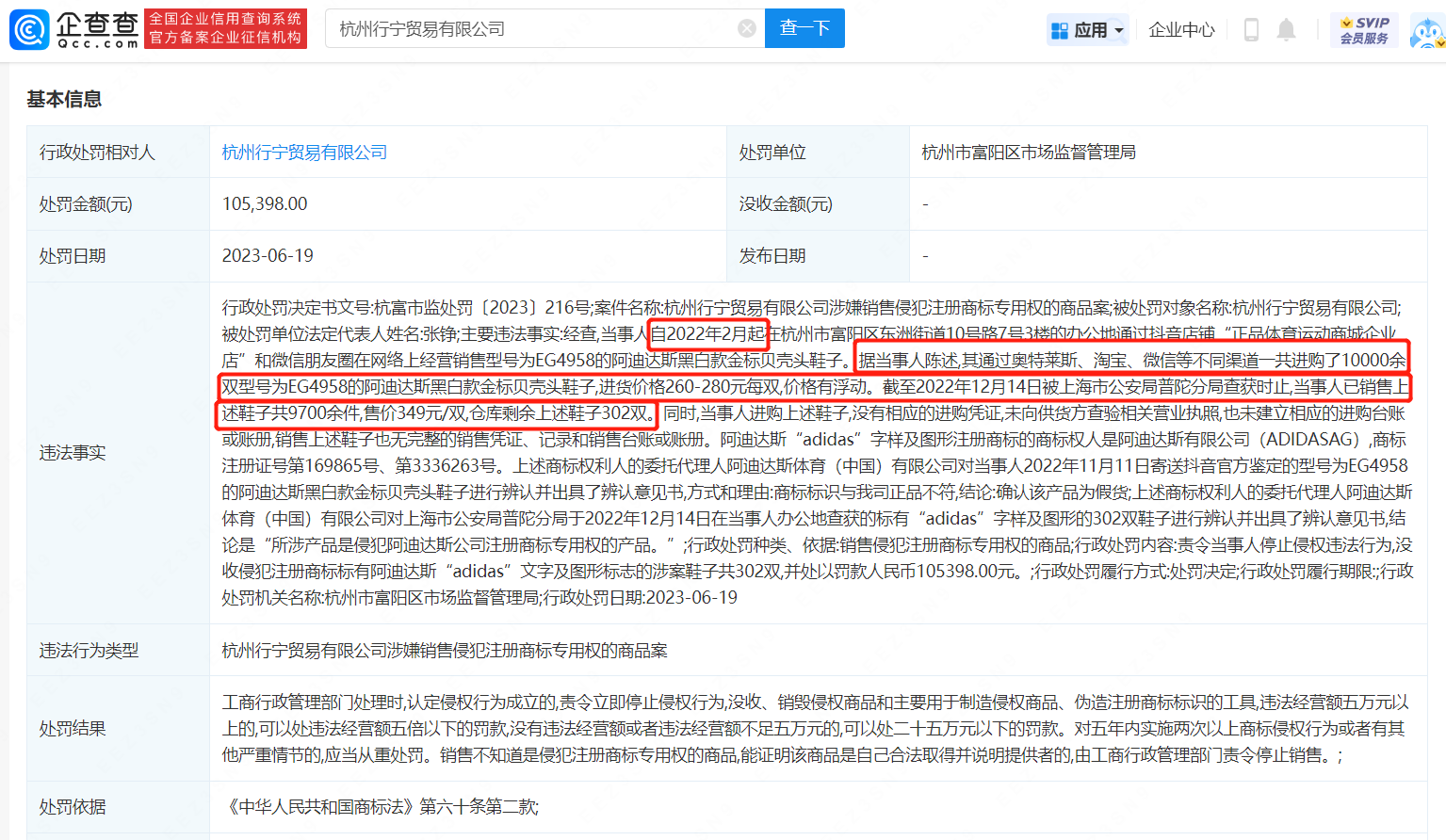 处罚详情显示,该公司通过奥特莱斯、某宝、微信等不同渠道一共进购了1万余双型号为EG4958的阿迪达斯黑白款金标贝壳头鞋子,进货价格260-280元每双,价格有浮动。自2022年2月至12月,当事人已销售9700余件,售价349元/双。同时,当事人进购上述鞋子,没有相应的进购凭证,未向供货方查验相关营业执照,销售上述鞋子也无完整的销售凭证、记录和销售台账或账册。经阿迪达斯体育(中国)有限公司官方鉴定,确认该产品为假货。最终,该公司因销售侵犯注册商标专用权的商品,被杭州市富阳区市场监督管理局没收剩余的302双鞋子,并罚款10.54万元。