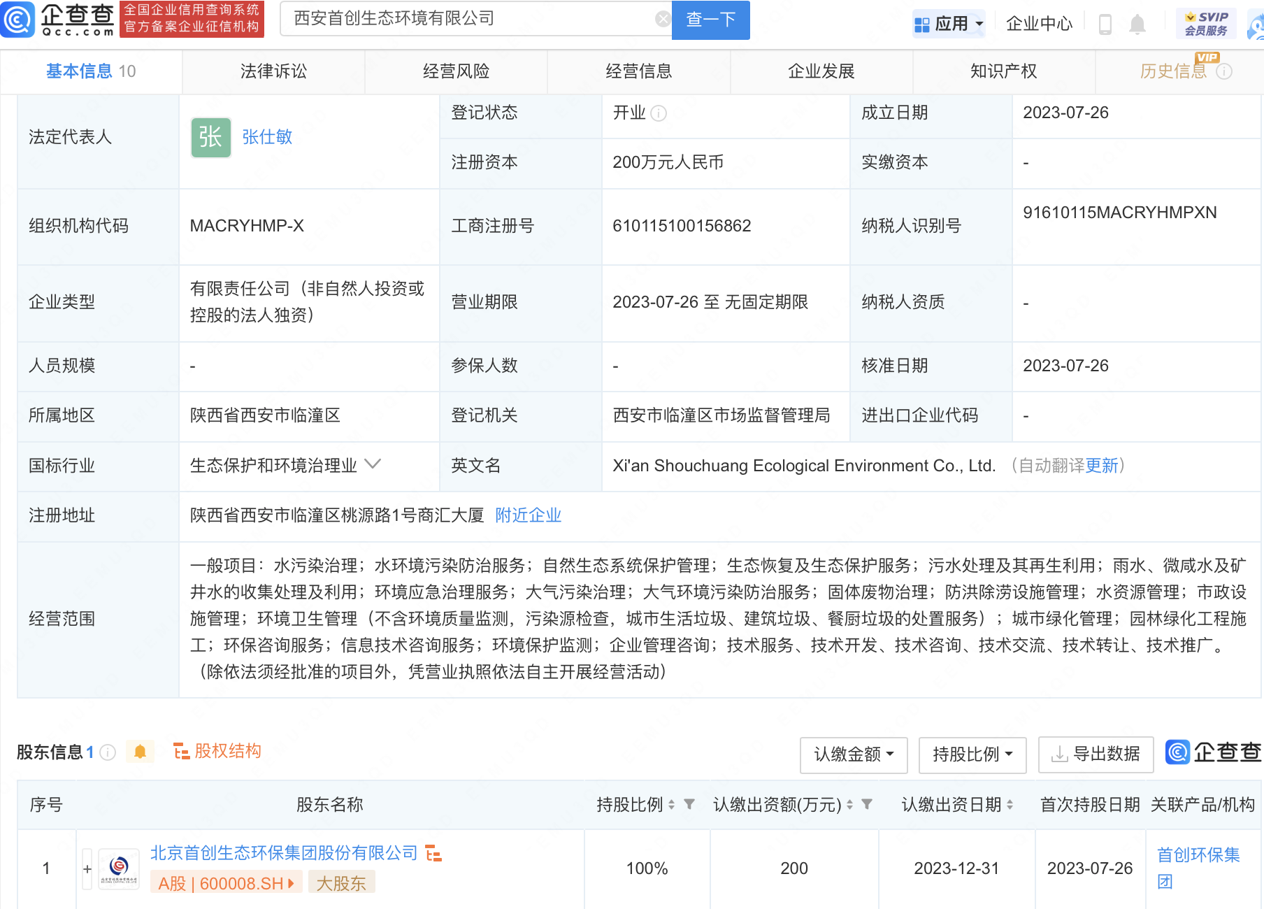 企查查APP显示,近日,西安首创生态环境有限公司成立,法定代表人为张仕敏,注册资本200万元人民币,经营范围包含:自然生态系统保护管理;生态恢复及生态保护服务;污水处理及其再生利用等。企查查股权穿透显示,该公司由首创环保(600008)100%控股。