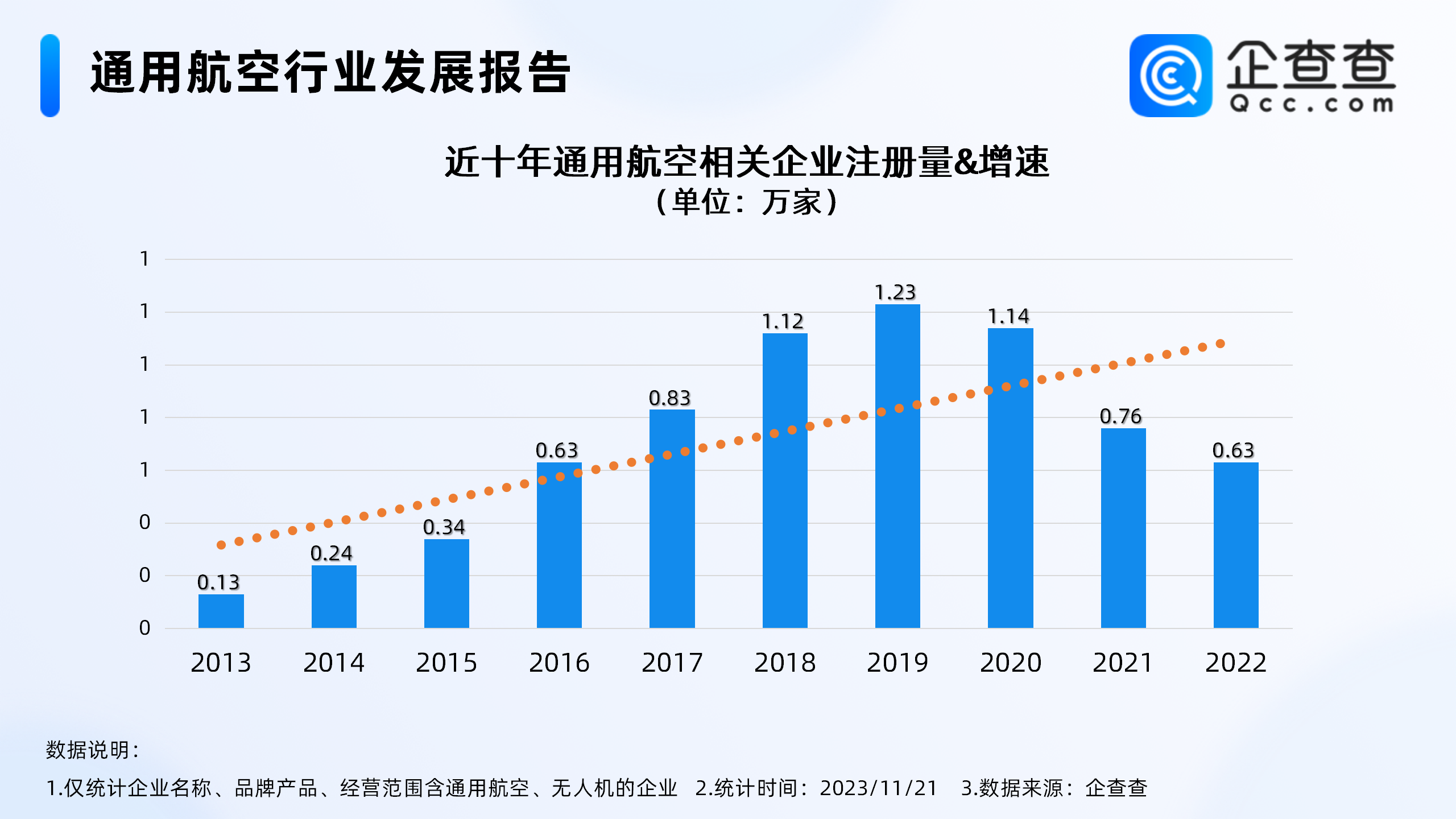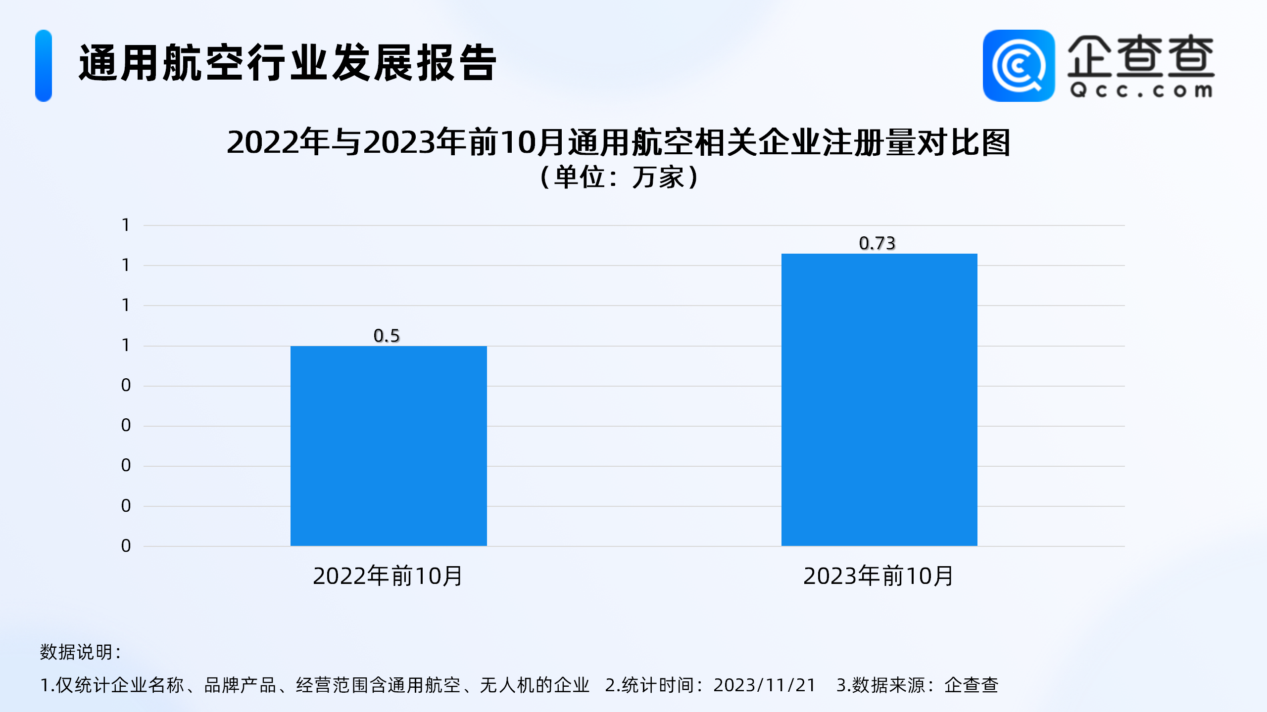 企查查数据显示,2022年及2023年前10月,我国通用航空相关企业分别新增0.5万家、0.73万家,同比增长45.85%。