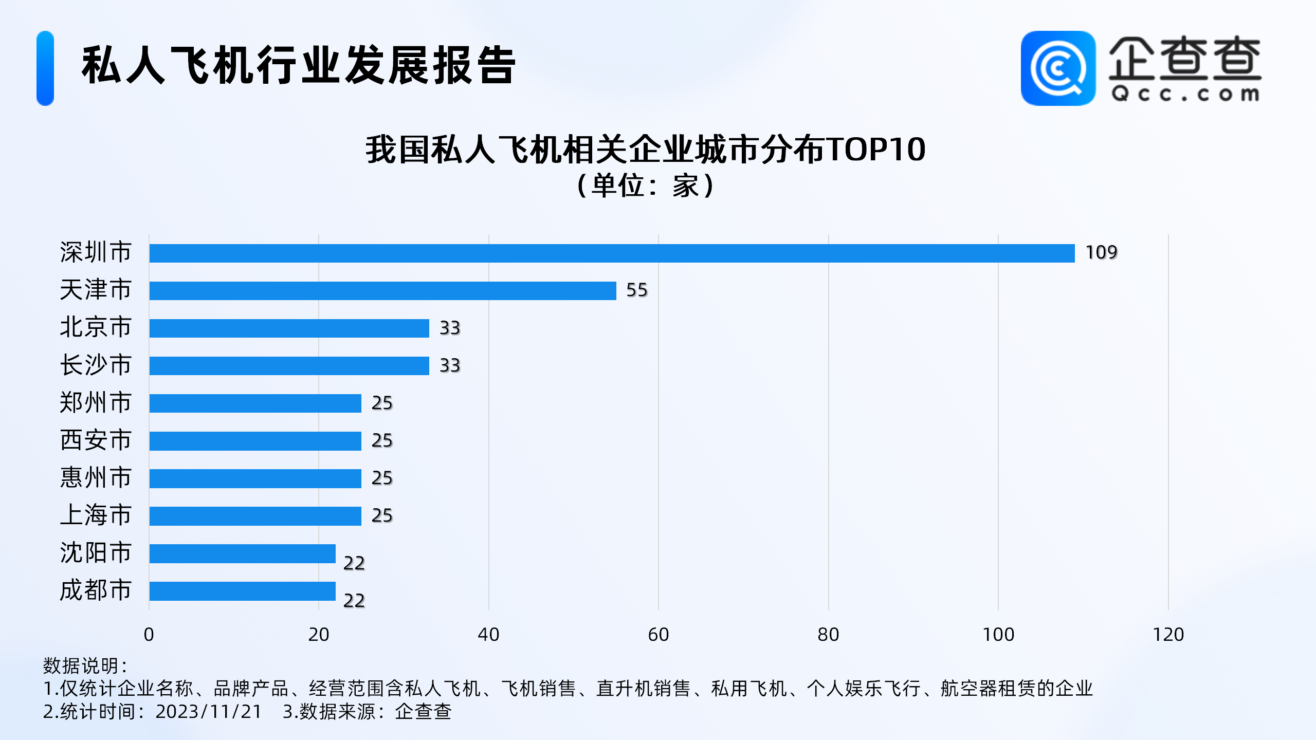 从城市来看,深圳现存109家私人飞机相关企业,位居第一。天津现存55家位居第二。北京、长沙均现存33家,位居前三。此后是上海、惠州、西安、郑州等地。