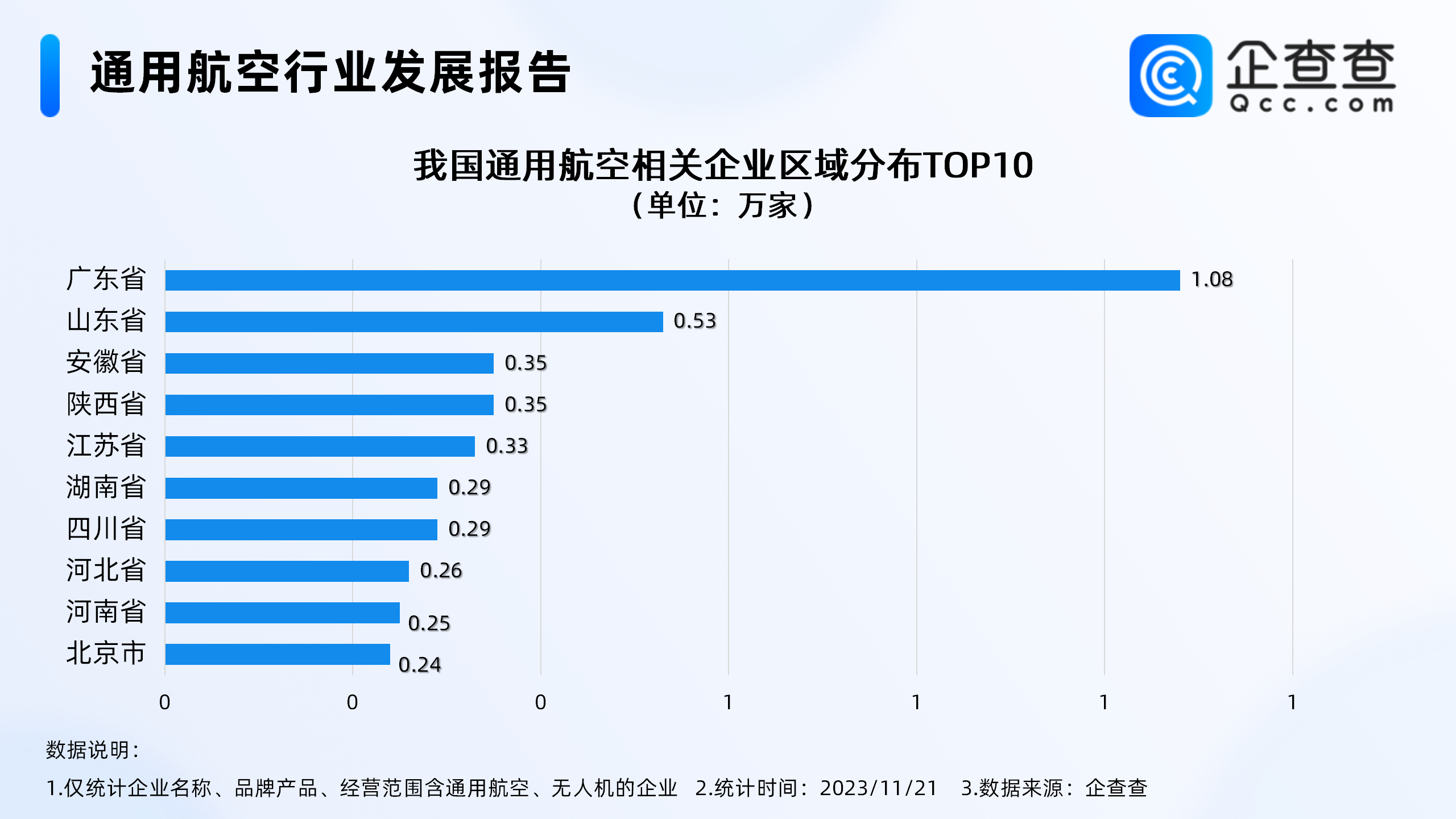 企查查数据显示,我国现存通用航空相关企业6.59万家。截至目前,今年我国通用航空相关企业新增0.77万家,已超去年全年注册量,其中,2023年前10月新增0.73万家,同比增长45.85%。 从区域来看,广东现存1.08万家,位居第一。山东、安徽分别现存0.53万家、0.35万家,位居前三。此后是陕西、江苏、湖南等地。