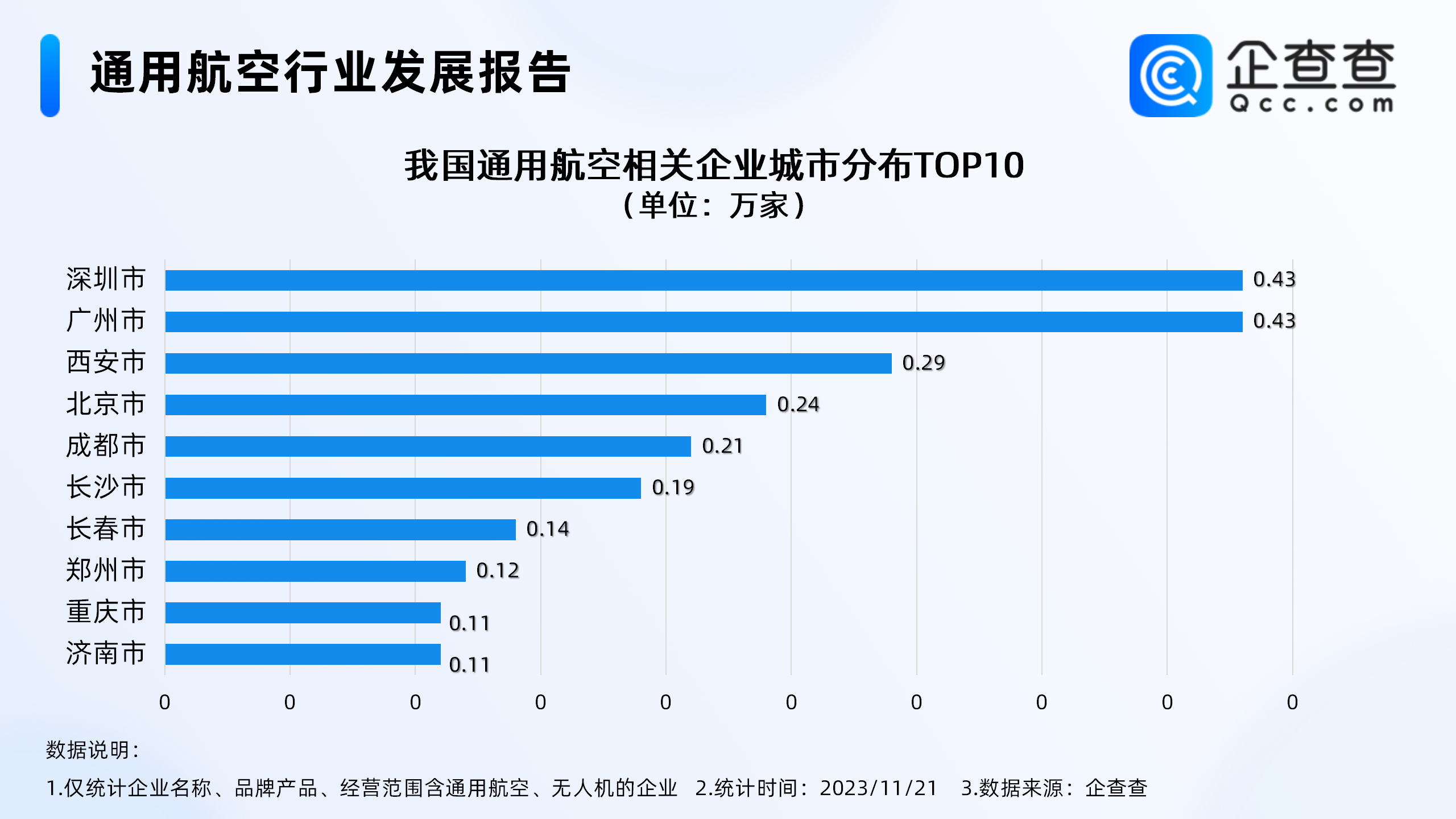 企查查数据显示,深圳市现存4303家通用航空相关企业位居第一。广州、西安分别现存4296家、2902家通用航空相关企业,位居前三。此后是北京、成都、长沙等地。