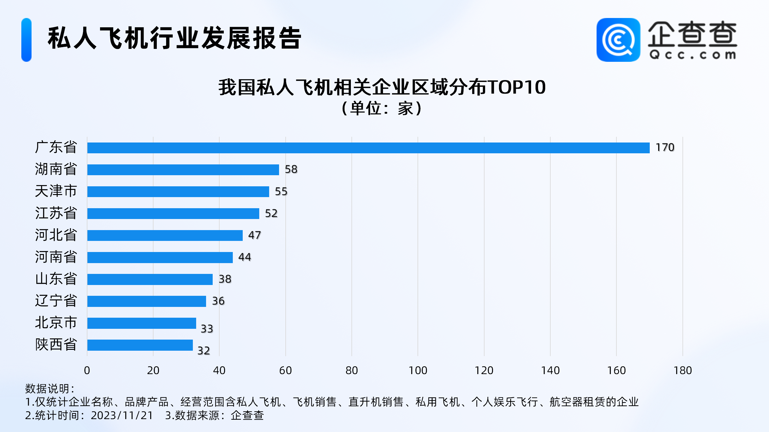 据企查查数据显示,我国现存私人飞机相关企业894家。从区域来看,广东省现存170家私人飞机相关企业,占全国近两成。湖南、天津分别现存58家、55家,位居前三。此后是江苏、河北等地。
