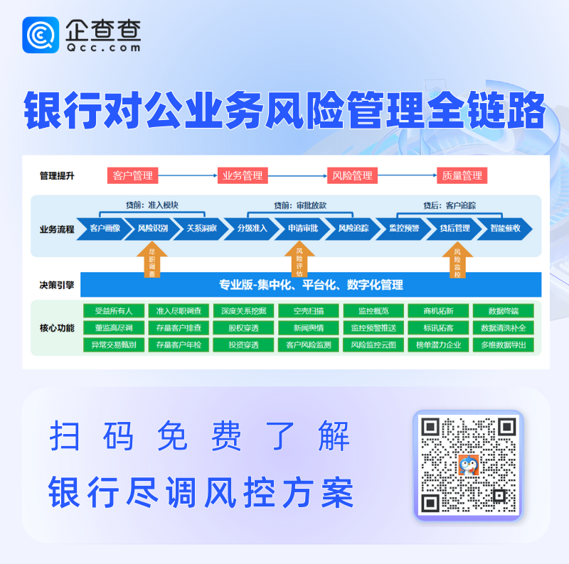 在此背景下,作为企业信息查询的领先平台,企查查融合监管政策与金融机构业务实证研究,探索了一套更加符合银行自身业务及产品形态的风险管理解决方案。