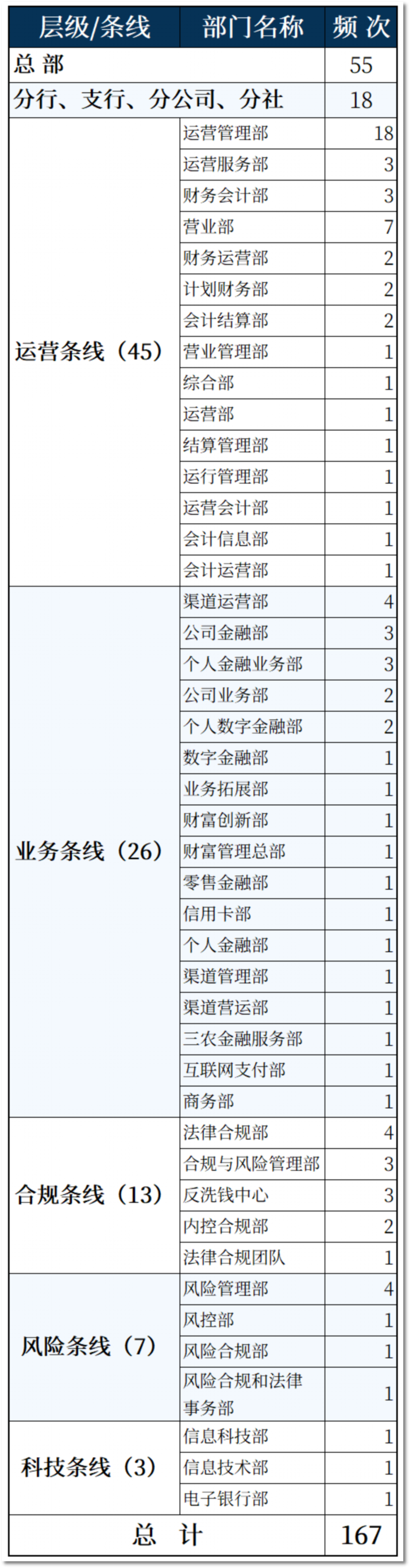 由于不同类型机构所对应的职务名称有差异,比如银行、支付机构的同类管理及业务部门对职务称呼上的不同,举例来说,银行多数职务表达为“XXXX部总经理”,而支付机构可称为“XXXX部总监”。为确保分析结果的准确性,将严格按照不同类型机构对应的职务进行归集,无法统一归集的职位予以单列。