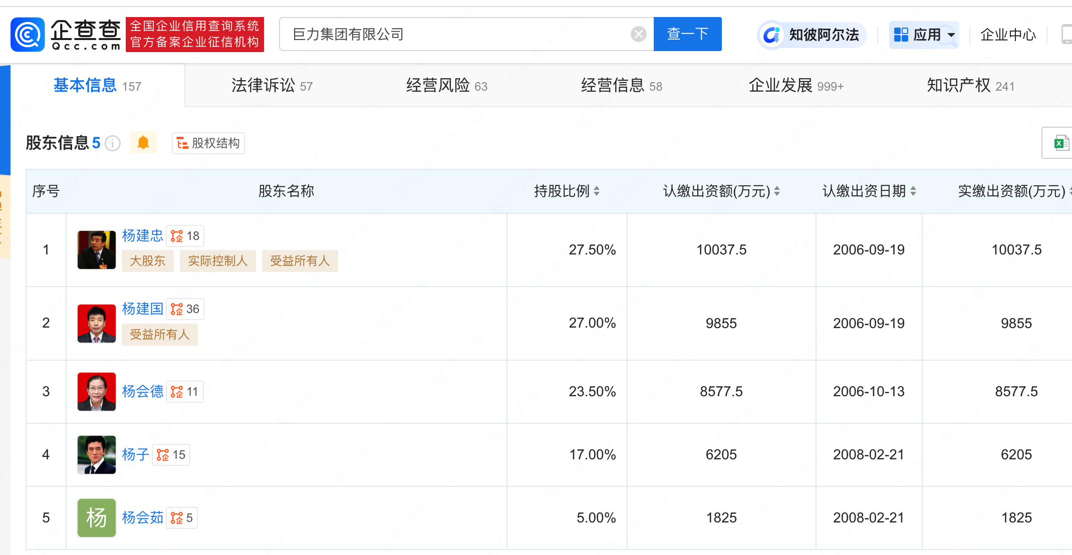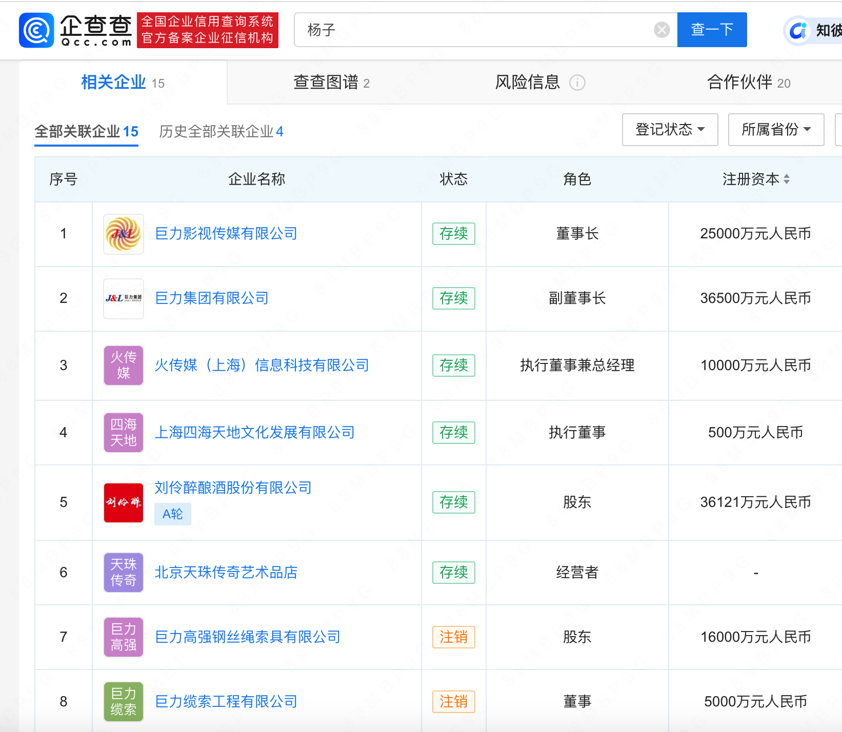 查询企查查APP发现,杨子名下关联15家公司,6家为存续状态,并持有巨力集团有限公司17%股份。黄圣依名下关联8家公司,3家为存续状态。值得一提的是,杨子与黄圣依当前共同关联2家公司,为巨力影视传媒有限公司、上海四海天地文化发展有限公司。