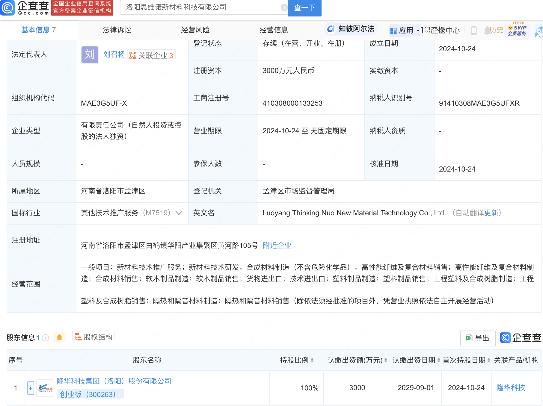 企查查APP显示,近日,洛阳思维诺新材料科技有限公司成立,法定代表人为刘召杨,注册资本3000万元人民币,经营范围包含:高性能纤维及复合材料销售;高性能纤维及复合材料制造等。企查查股权穿透显示,该公司由隆华科技(300263)全资持股。