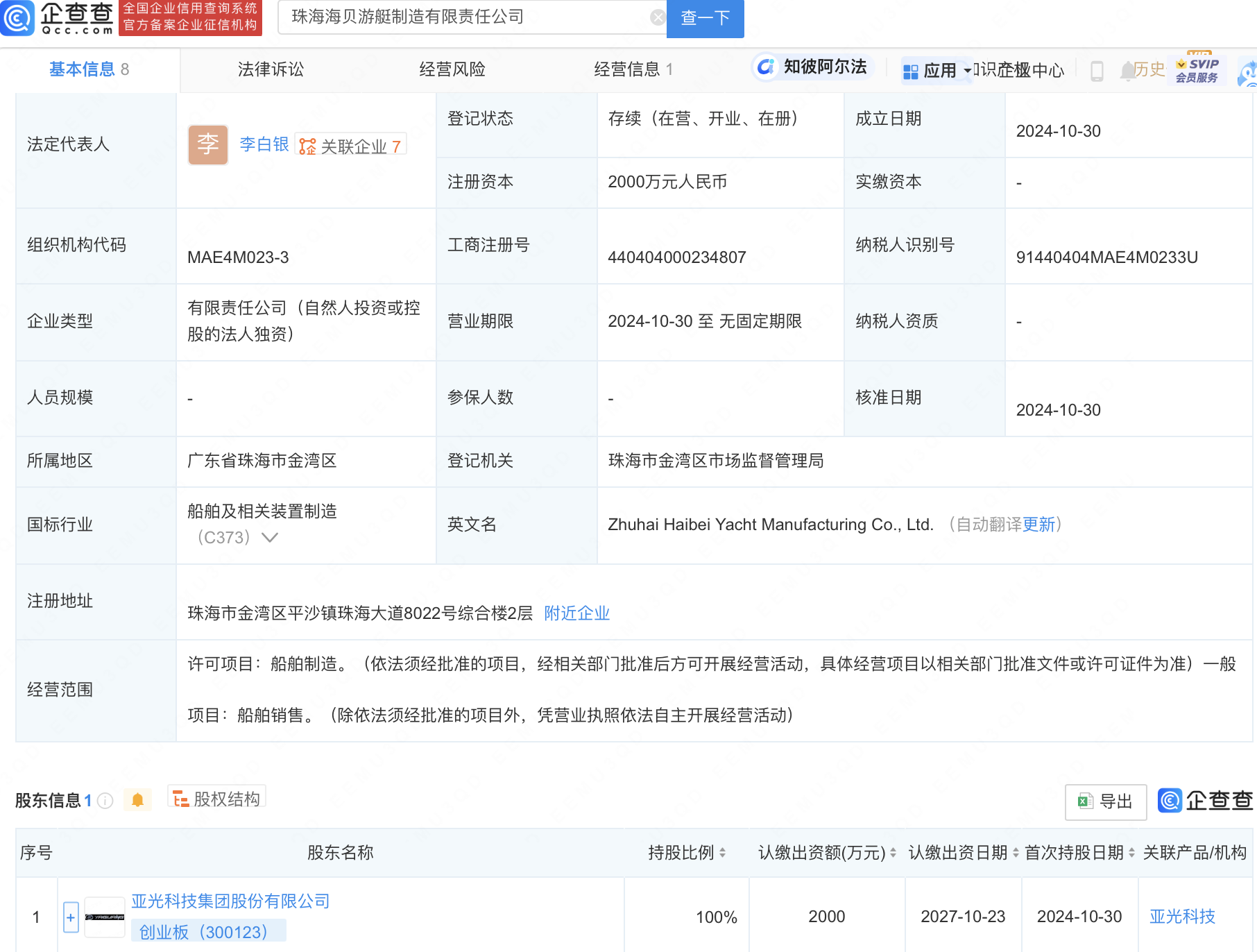 企查查APP显示,近日,珠海海贝游艇制造有限责任公司成立,法定代表人为李白银,注册资本2000万元人民币,经营范围包含:船舶制造;船舶销售。企查查股权穿透显示,该公司由亚光科技(300123)全资持股。