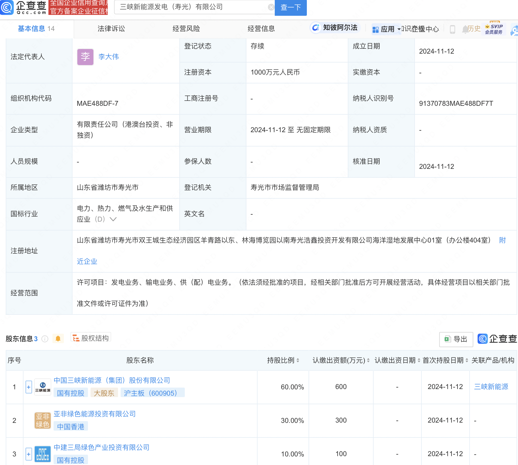 企查查APP显示,近日,三峡新能源发电(寿光)有限公司成立,法定代表人为李大伟,注册资本1000万元人民币,经营范围包含:发电业务、输电业务、供(配)电业务。企查查股权穿透显示,该公司由三峡能源(600905)等共同持股。