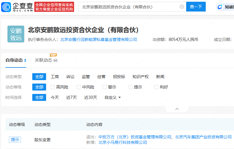 企查查APP显示,近日,北京安鹏致远投资合伙企业(有限合伙)发生工商变更,原股东北京汽车集团产业投资有限公司、中投万方(北京)投资基金管理有限公司退出,新增股东小马智行关联公司北京小马易行科技有限公司。