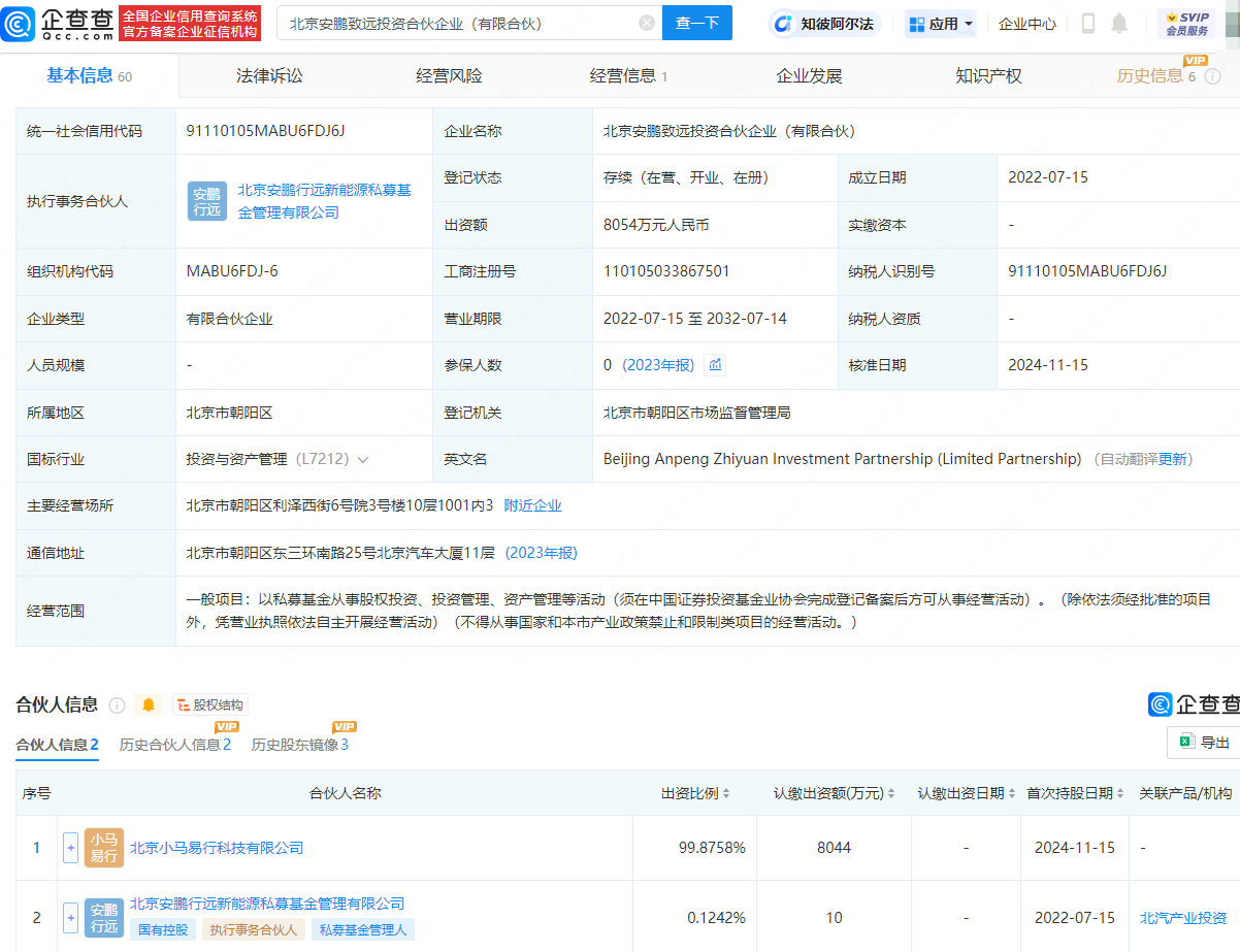 企查查显示,北京安鹏致远投资合伙企业(有限合伙)成立于2022年7月,经营范围为以私募基金从事股权投资、投资管理、资产管理等活动,现由北京小马易行科技有限公司、北京安鹏行远新能源私募基金管理有限公司共同持股。