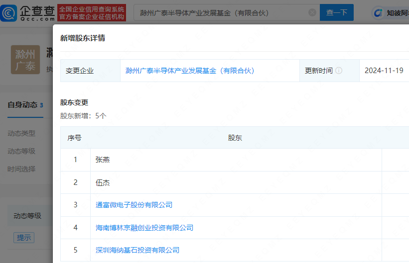 企查查APP显示,近日,滁州广泰半导体产业发展基金(有限合伙)发生工商变更,新增通富微电(002156)、深圳海纳基石投资有限公司、海南博林京融创业投资有限公司等5位股东。