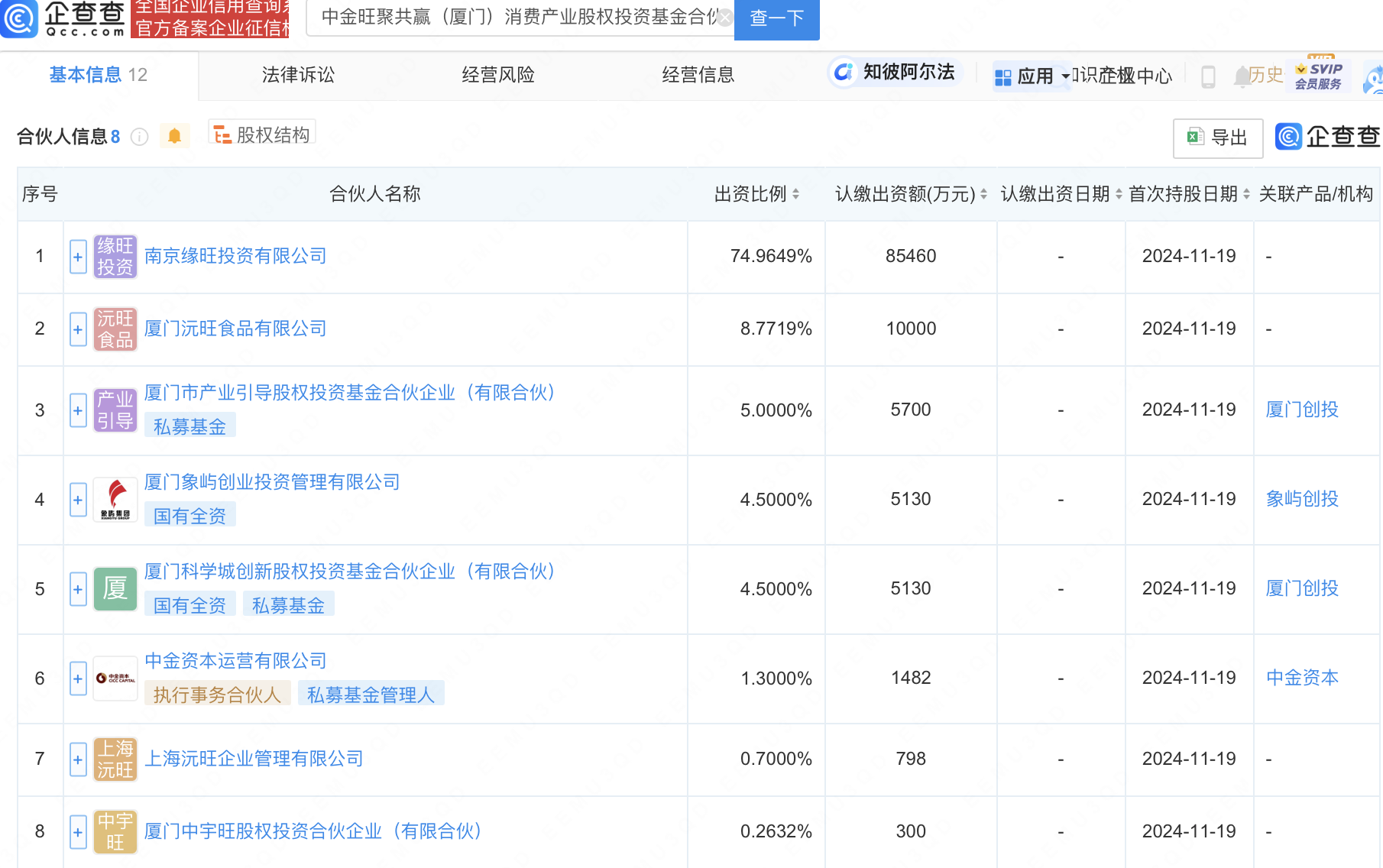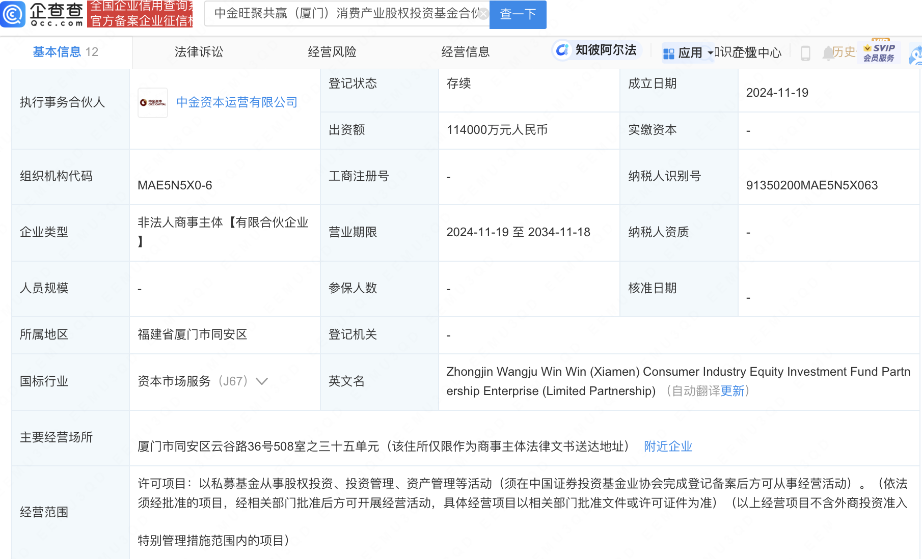 企查查APP显示,近日,中金旺聚共赢(厦门)消费产业股权投资基金合伙企业(有限合伙)成立,出资额11.4亿人民币,经营范围为以私募基金从事股权投资、投资管理、资产管理等活动。企查查股权穿透显示,该企业由中金资本运营有限公司等共同持股。
