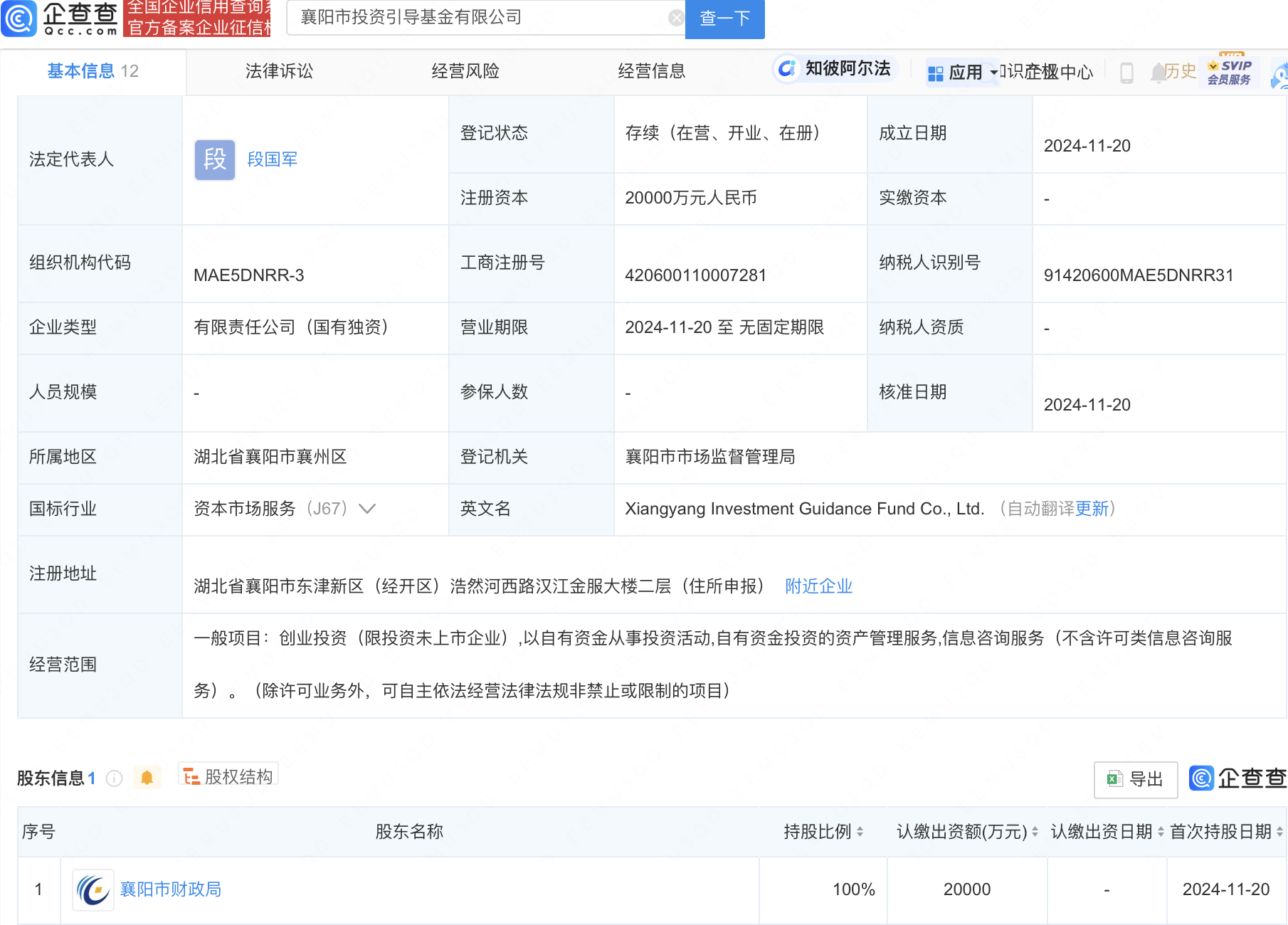 企查查APP显示,近日,襄阳市投资引导基金有限公司成立,法定代表人为段国军,注册资本2亿元,经营范围为创业投资、以自有资金从事投资活动、自有资金投资的资产管理服务、信息咨询服务。企查查股权穿透显示,该公司由襄阳市财政局全资持股。
