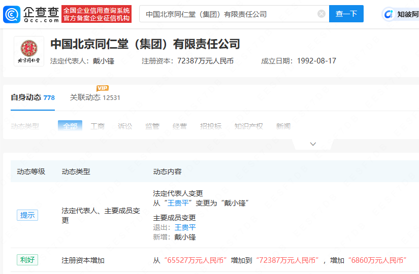 企查查APP显示,近日,中国北京同仁堂(集团)有限责任公司发生工商变更,王贵平卸任法定代表人、董事长,由戴小锋接任,同时注册资本由约6.55亿人民币增至约7.24亿人民币。据悉,此前同仁堂集团召开干部大会,宣布戴小锋同志任中国北京同仁堂(集团)有限责任公司党委书记、董事长。