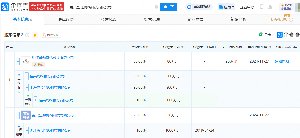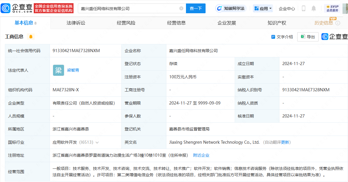 企查查APP显示,近日,嘉兴盛任网络科技有限公司成立,法定代表人为梁智青,注册资本为100万元人民币,经营范围包含:软件开发;软件销售;信息技术咨询服务;第二类增值电信业务等。企查查股权穿透显示,该公司由恺英网络(002517)间接全资持股。