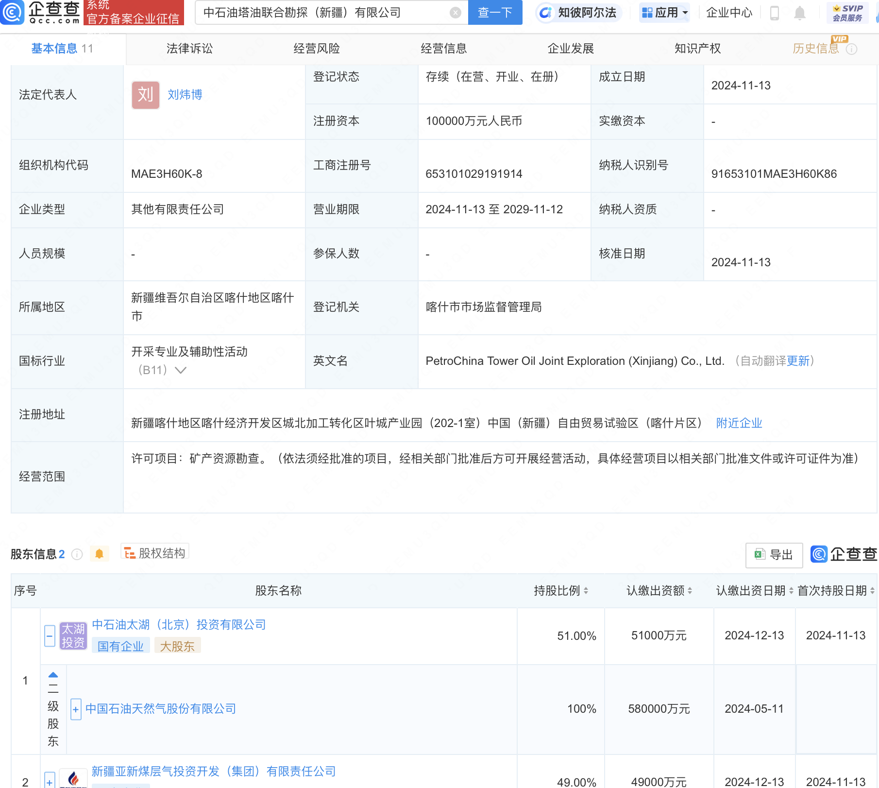 企查查APP显示,近日,中石油塔油联合勘探(新疆)有限公司成立,法定代表人为刘炜博,注册资本10亿元人民币,经营范围包含:矿产资源勘查。企查查股权穿透显示,该公司由中国石油(601857)全资子公司中石油太湖(北京)投资有限公司、新疆亚新煤层气投资开发(集团)有限责任公司共同持股。