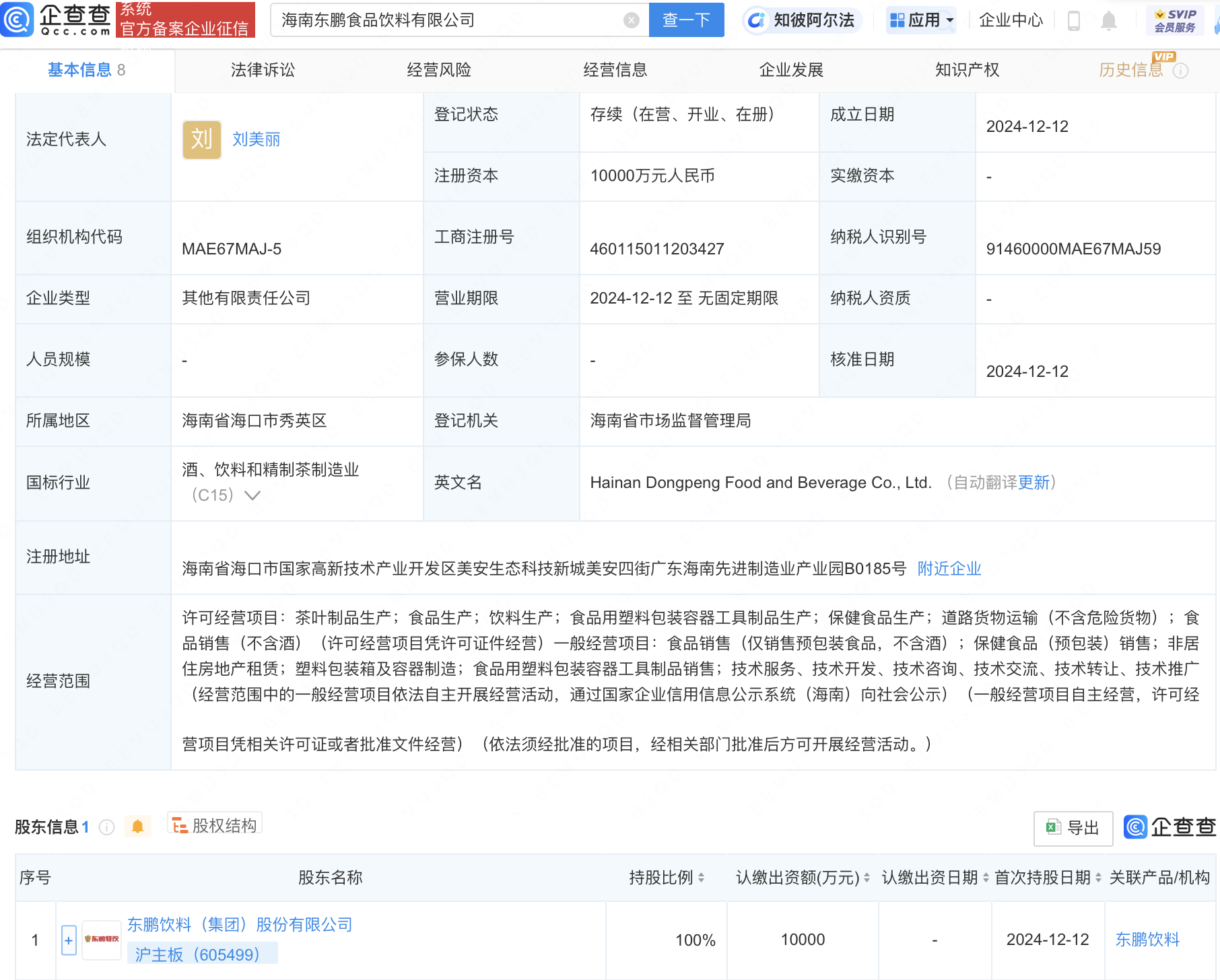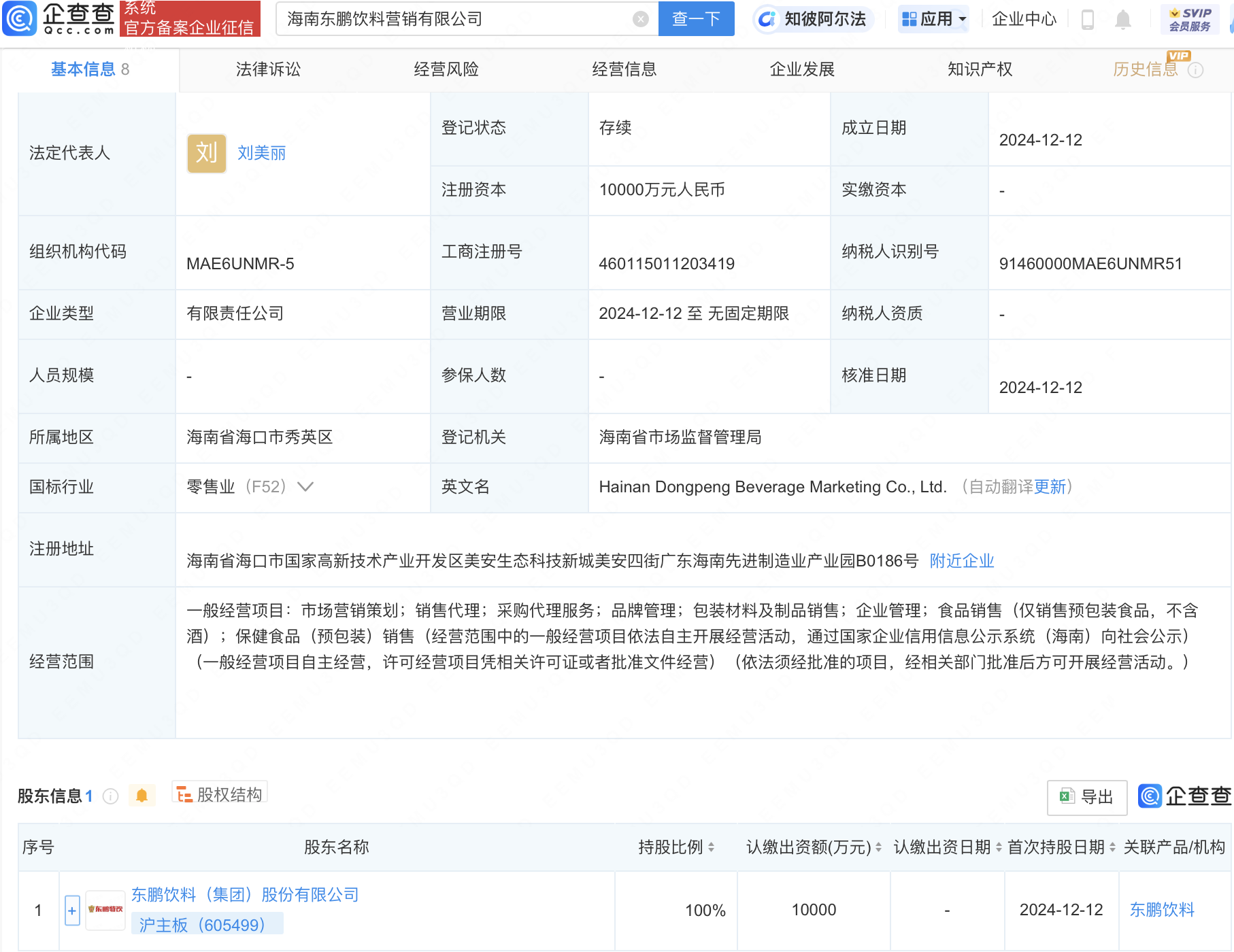 企查查APP显示,近日,海南东鹏饮料营销有限公司、海南东鹏食品饮料有限公司成立,法定代表人同为刘美丽,注册资本均为1亿元人民币。企查查股权穿透显示,二者皆由东鹏饮料(605499)全资持股。