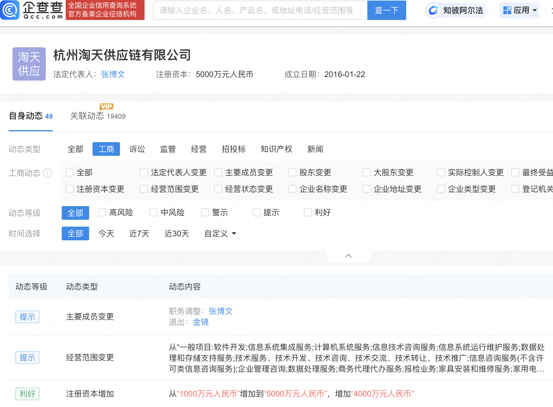 企查查APP显示,近日,杭州淘天供应链有限公司发生工商变更,注册资本由1000万人民币增至5000万人民币。企查查信息显示,该公司成立于2016年,法定代表人为张博文,经营范围含供应链管理服务、专业设计服务、社会经济咨询服务等,由阿里巴巴(中国)网络技术有限公司全资持股。