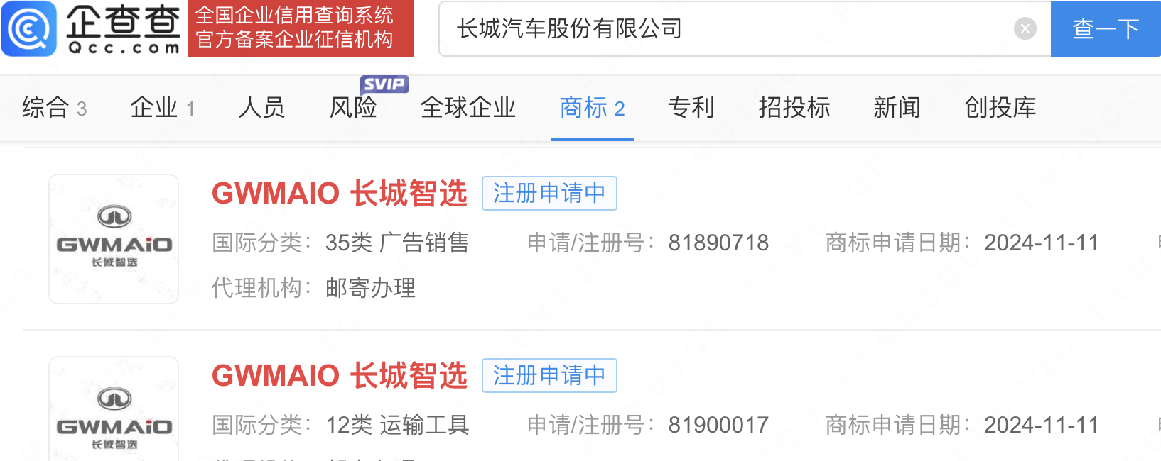 企查查APP显示,近日,长城汽车(601633)申请注册2枚“GWMAiO 长城智选”商标,国际分类为广告销售、运输工具,当前商标状态均为注册申请中。
