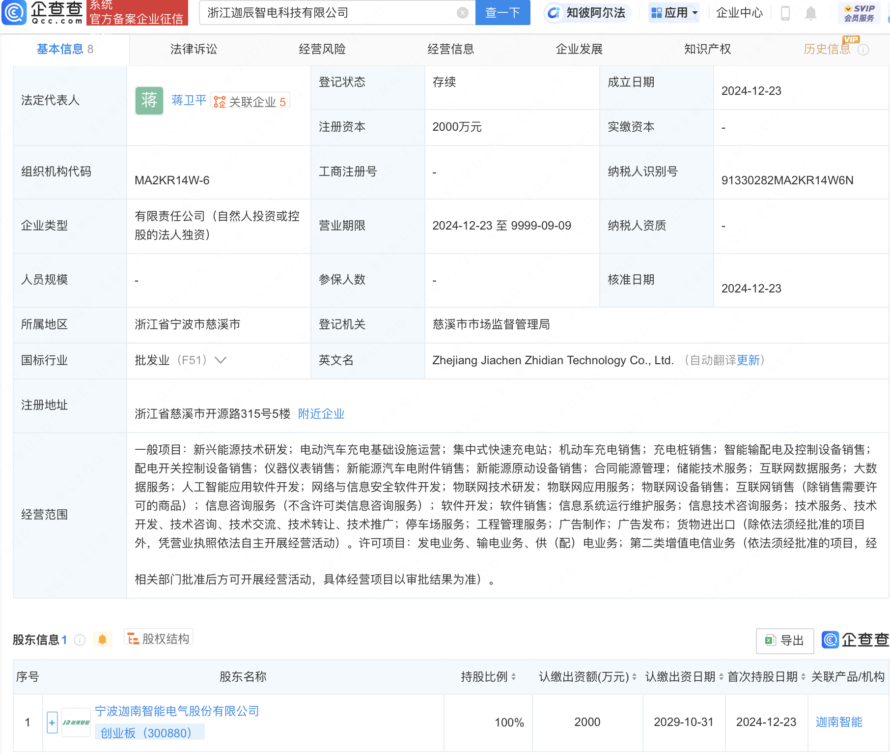 企查查APP显示,近日,浙江迦辰智电科技有限公司成立,法定代表人为蒋卫平,注册资本2000万元,经营范围包含:人工智能应用软件开发;物联网技术研发;物联网应用服务;物联网设备销售等。企查查股权穿透显示,该公司由迦南智能(300880)全资持股。