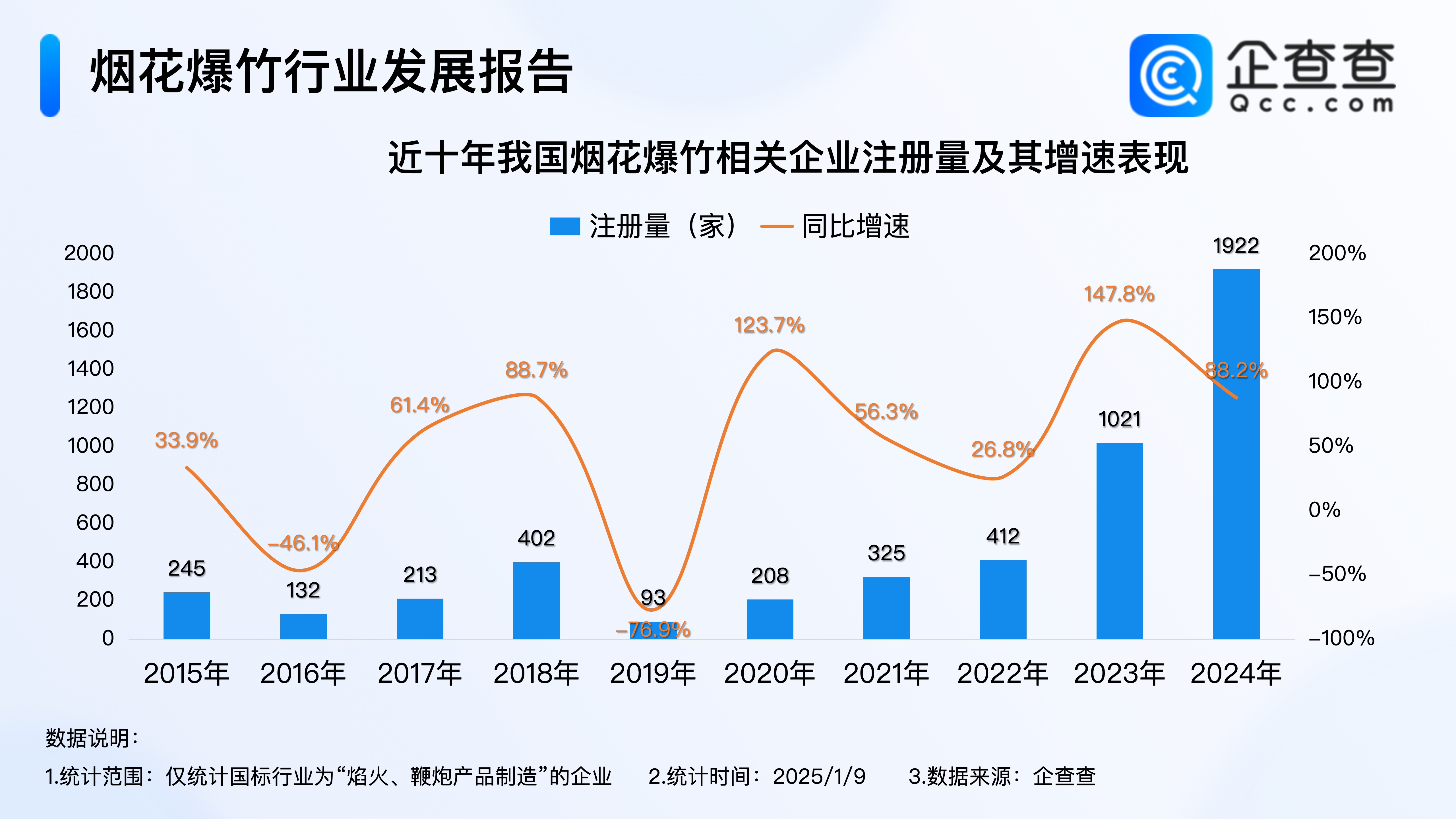 企查查数据显示,2020年以来,我国烟花爆竹相关企业注册量逐年增加,尤其是2023年,全年注册量同比大幅增加147.8%至1021家,达近十年注册量增速峰值,在此基础上,2024年我国累计注册1922家烟花爆竹相关企业,同比增加88.2%,创近十年注册量新高。