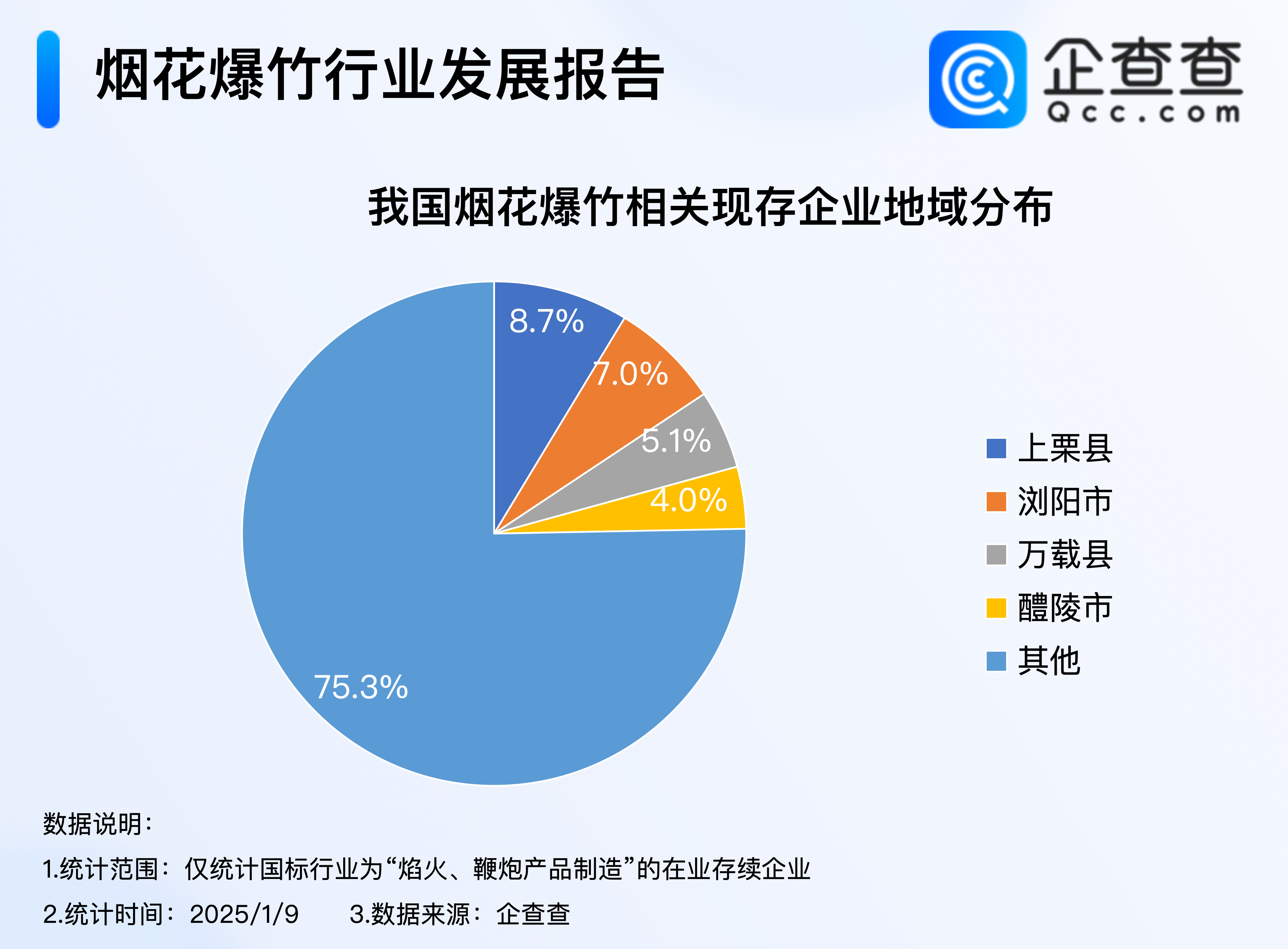 企查查数据显示,地域分布上,我国素有“中国烟花爆竹之乡”的上栗县现存烟花爆竹相关企业最多,占比8.7%,其次是“中国烟花之乡”浏阳市,占比7.0%,前述两地与另外两大产地万载县、醴陵市合计占比25%。