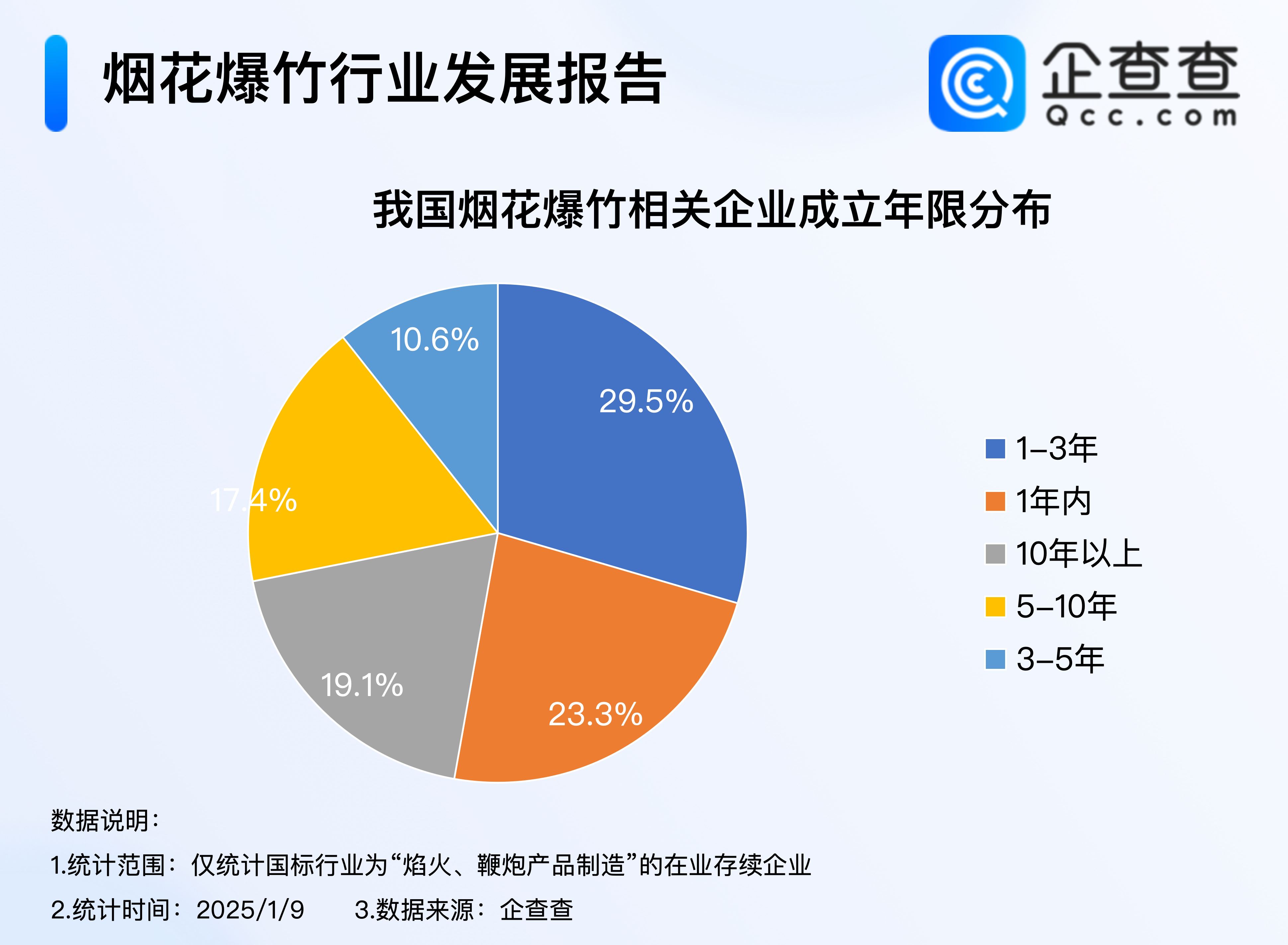 企查查数据显示,我国现存4029家烟花爆竹相关企业。成立年限上,我国超五成烟花爆竹相关企业在3年内成立,其中成立1-3年的企业最多,占比29.5%,成立1年内的企业占比23.3%。