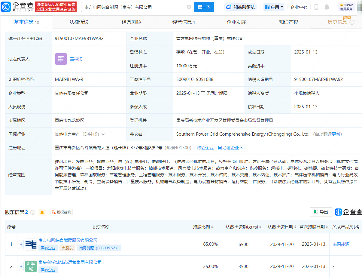 企查查APP显示,近日,南方电网综合能源(重庆)有限公司成立,法定代表人为董褔海,注册资本为1亿元,经营范围包含:发电业务、输电业务、供(配)电业务;供暖服务;储能技术服务;风力发电技术服务;热力生产和供应;供冷服务等。企查查股权穿透显示,该公司由南网能源(003035)、重庆科学城城市运营集团有限公司共同持股。