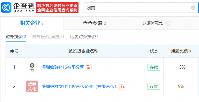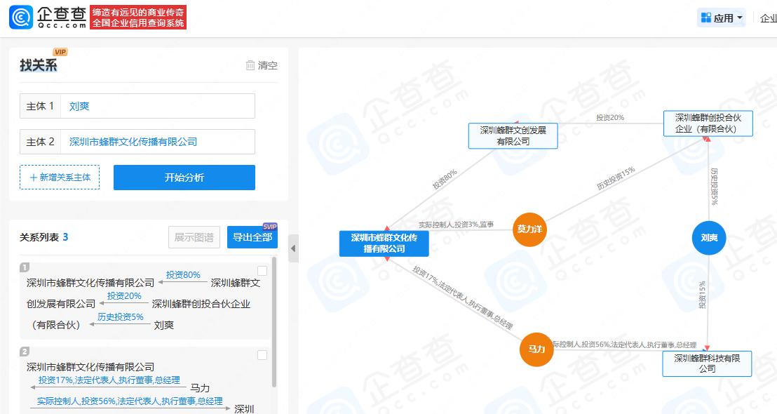 值得注意的是,刘爽曾于2024年5月退出深圳蜂群创投合伙企业(有限合伙)股东行列,该合伙企业间接持有深圳蜂群文化传播公司16%股权。