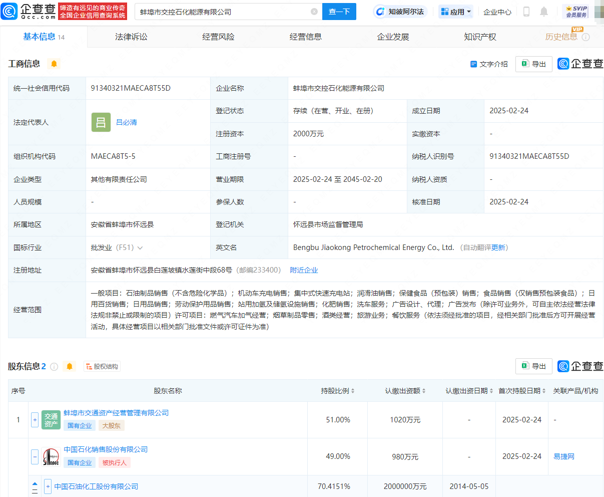 企查查APP显示,近日,蚌埠市交控石化能源有限公司成立,法定代表人为吕必清,注册资本为2000万元,经营范围包含:机动车充电销售;集中式快速充电站;润滑油销售;保健食品(预包装)销售;日用百货销售;日用品销售;劳动保护用品销售等。企查查股权穿透显示,该公司由中国石化(600028)旗下中国石化销售股份有限公司、蚌埠市交通资产经营管理有限公司共同持股。