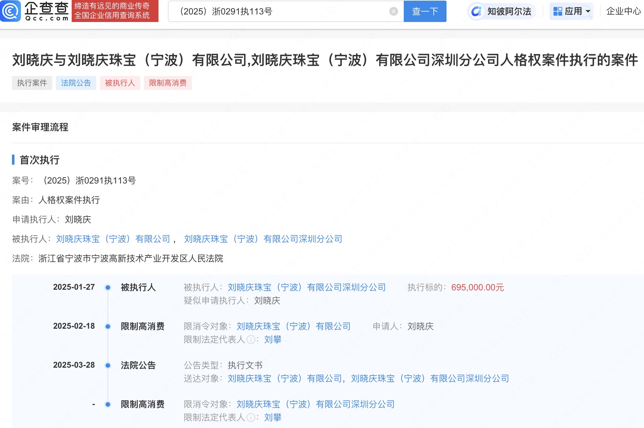 公告显示,法院判决被告刘晓庆珠宝(宁波)有限公司、刘晓庆珠宝(宁波)有限公司深圳分公司停止使用原告刘晓庆的姓名和肖像,向刘晓庆公开赔礼道歉并赔偿经济损失69.5万元,上述判决生效后,被告未履行致歉义务,刘晓庆申请强制执行。案件流程信息显示,此前上述两家公司及刘某等已因该案被限制高消费。