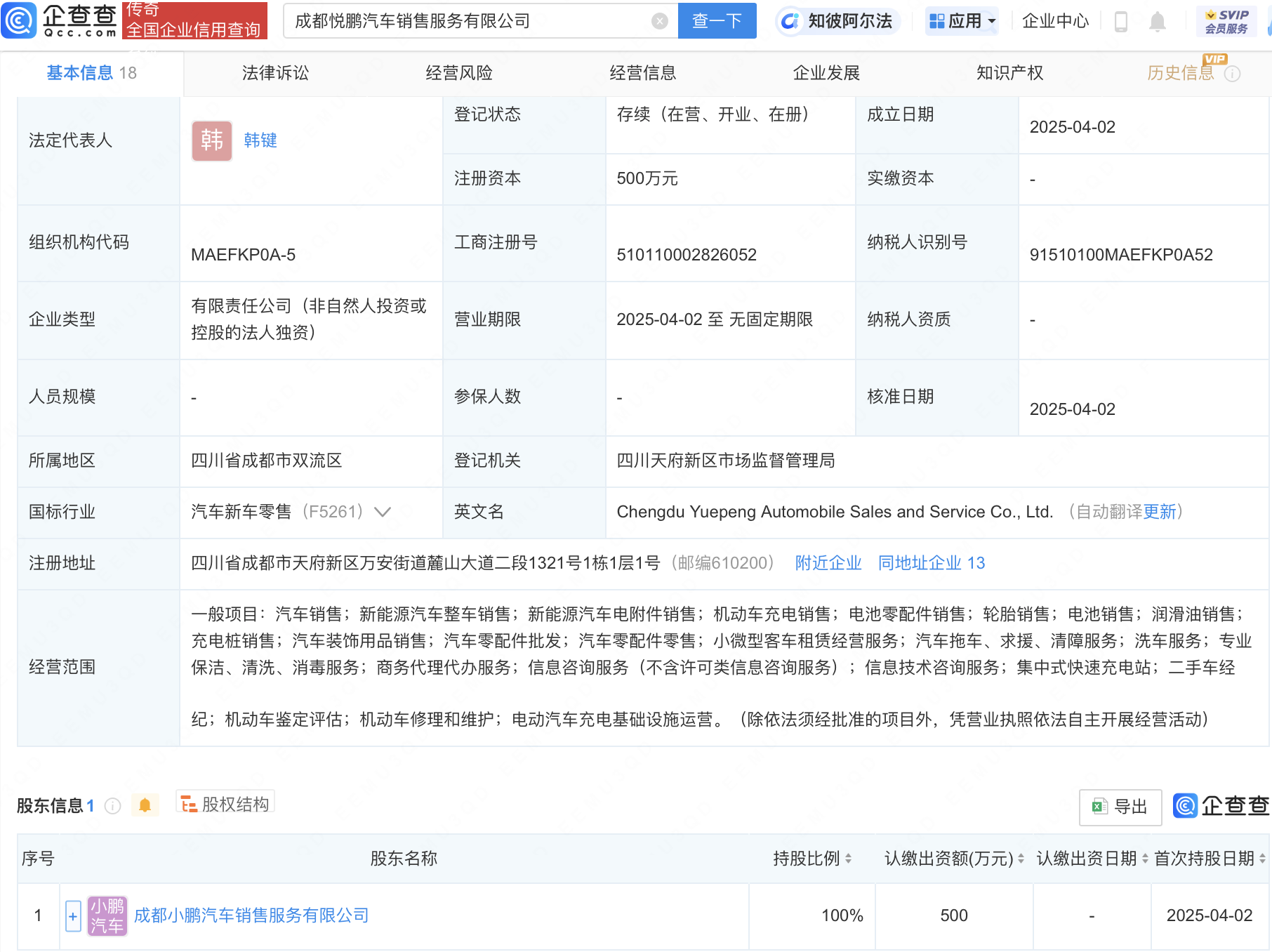 企查查APP显示,近日,成都悦鹏汽车销售服务有限公司成立,法定代表人为韩键,注册资本500万人民币,经营范围包括新能源汽车整车销售、新能源汽车电附件销售、机动车充电销售、电池零配件销售等。企查查股权穿透显示,该公司由成都小鹏汽车销售服务有限公司全资持股。