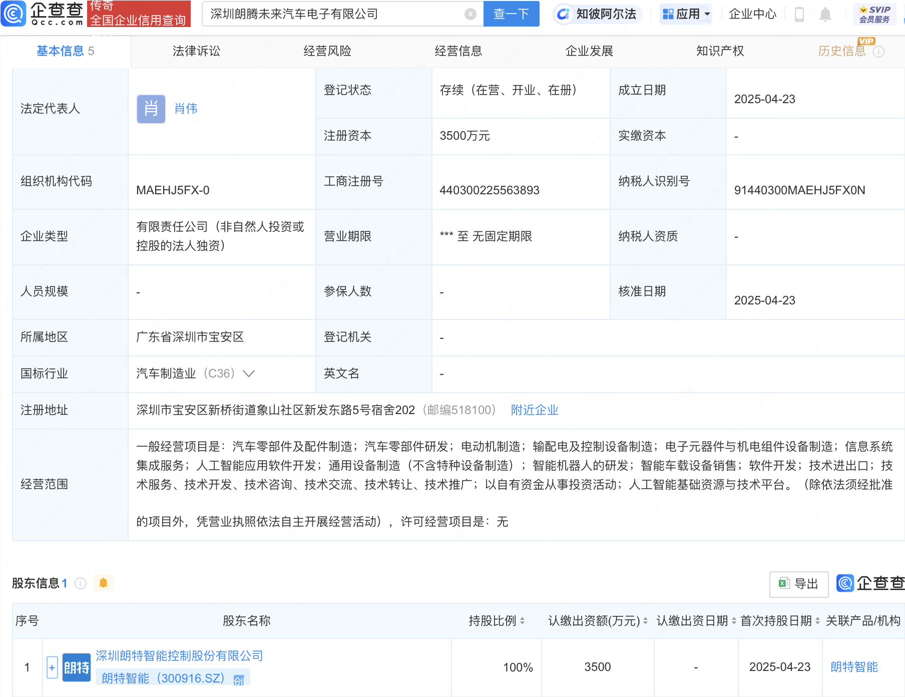 企查查APP显示,近日,深圳朗腾未来汽车电子有限公司成立,法定代表人为肖伟,注册资本3500万元,经营范围包含:汽车零部件及配件制造;人工智能应用软件开发;智能机器人的研发;智能车载设备销售等。企查查股权穿透显示,该公司由朗特智能(300916)全资持股。