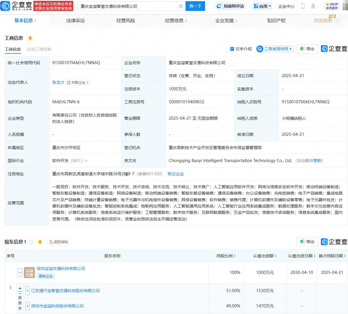 企查查APP显示,近日,重庆宝溢智慧交通科技有限公司成立,法定代表人为张龙才,注册资本为1000万元,经营范围包含:人工智能应用软件开发;网络与信息安全软件开发;移动终端设备制造;智能车载设备制造;通信设备制造等。企查查股权穿透显示,该公司由深圳宝溢交通科技有限公司全资持股,后者由通行宝(301339)、金溢科技(002869)共同持股。