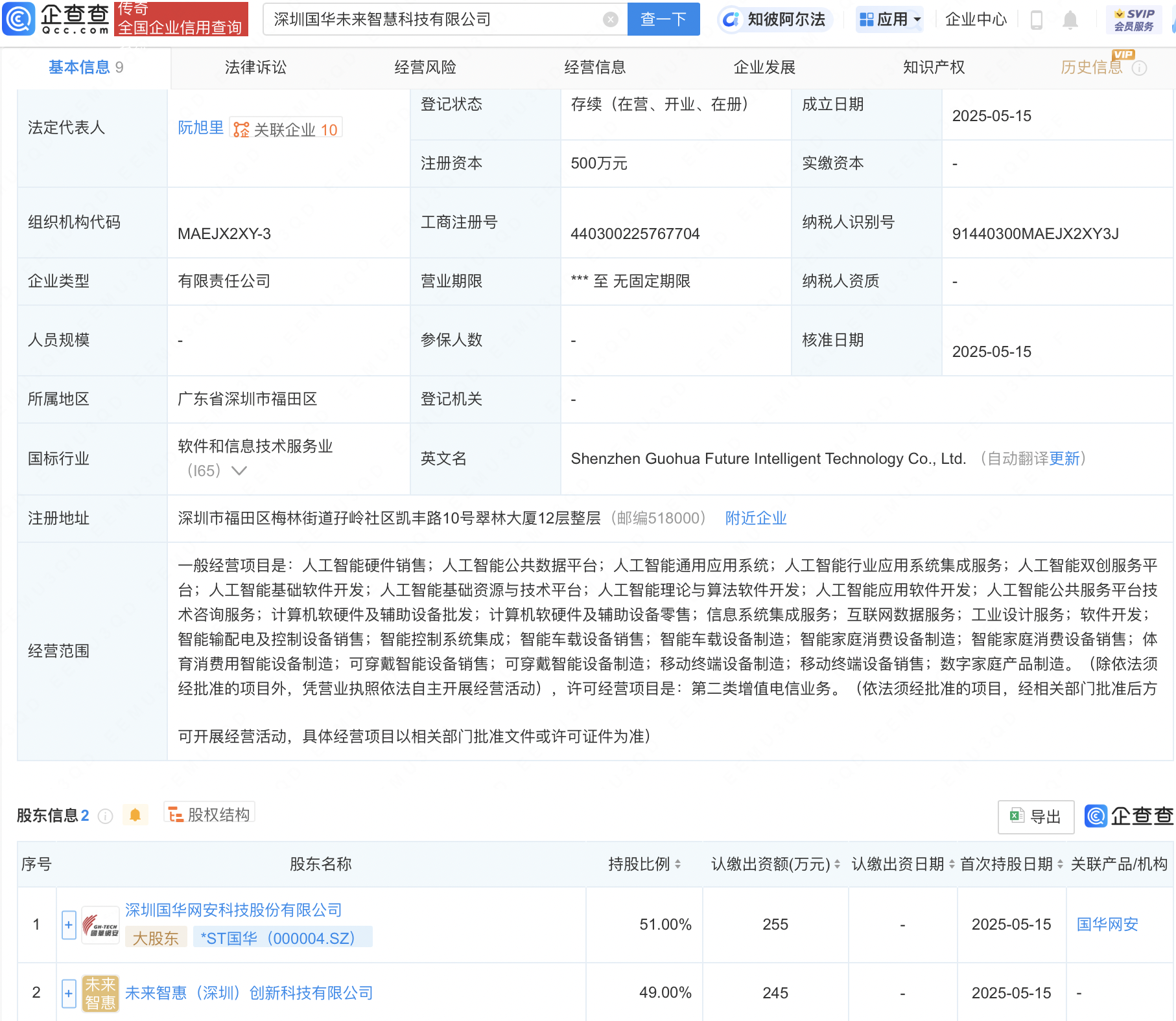 企查查APP显示,近日,深圳国华未来智慧科技有限公司成立,法定代表人为阮旭里,注册资本500万元,经营范围包含:人工智能硬件销售;人工智能公共数据平台;人工智能通用应用系统;人工智能行业应用系统集成服务等。企查查股权穿透显示,该公司由*ST国华(000004)等共同持股。