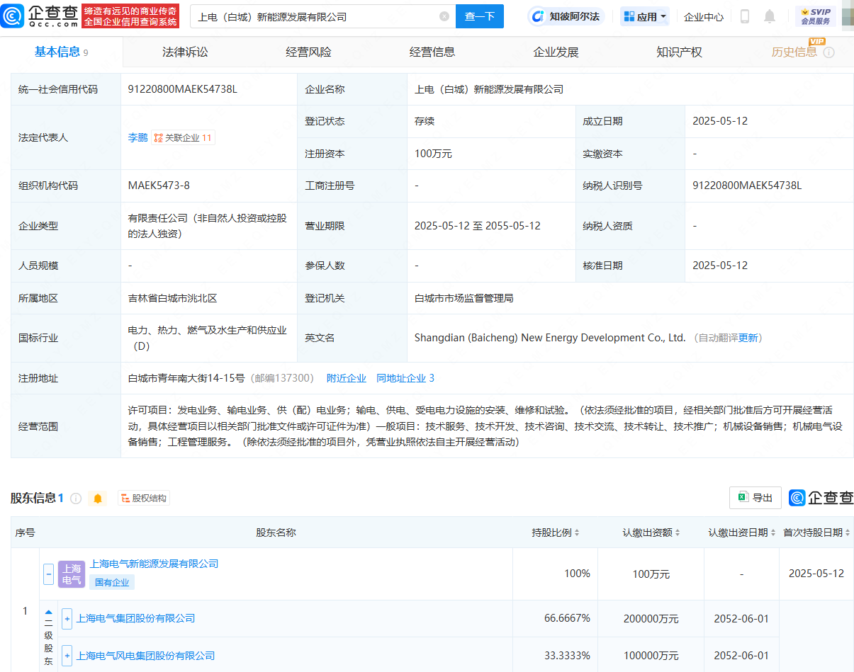 企查查APP显示,近日,上电(白城)新能源发展有限公司成立,法定代表人为李鹏,注册资本为100万元,经营范围包含:发电业务、输电业务、供(配)电业务;机械设备销售;机械电气设备销售;工程管理服务等。企查查股权穿透显示,该公司由上海电气新能源发展有限公司全资持股,后者由上海电气(601727)、电气风电(688660)共同持股。