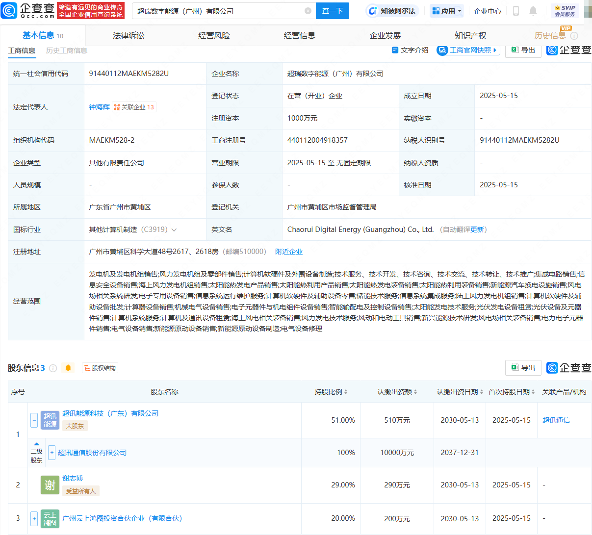 企查查APP显示,近日,超瑞数字能源(广州)有限公司成立,法定代表人为钟海辉,注册资本为1000万元,经营范围包含:发电机及发电机组销售;风力发电机组及零部件销售;集成电路销售;信息安全设备销售;海上风力发电机组销售;电力电子元器件销售等。企查查股权穿透显示,该公司由超讯通信(603322)旗下超讯能源科技(广东)有限公司等共同持股。