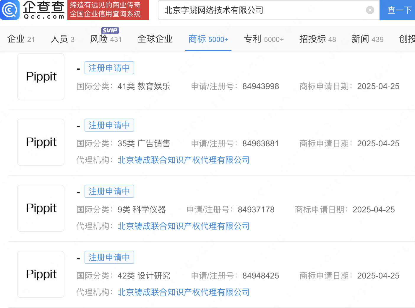 企查查APP显示,近日,北京字跳网络技术有限公司申请注册多枚“PIPPIT”商标,国际分类包括教育娱乐、科学仪器等,当前商标状态均为注册申请中。