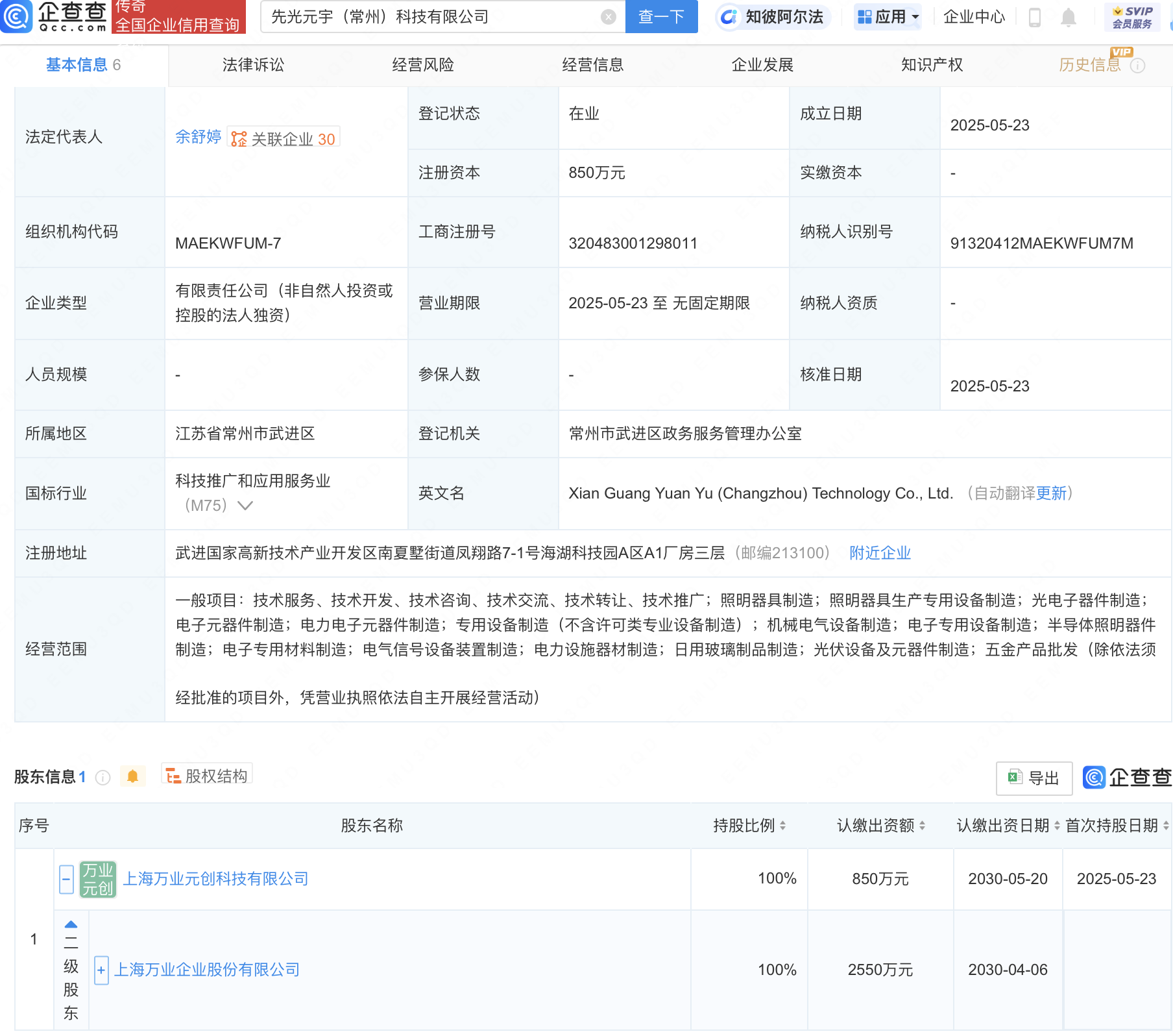 企查查APP显示,近日,先光元宇(常州)科技有限公司成立,法定代表人为余舒婷,经营范围包含:半导体照明器件制造;电子专用材料制造;电气信号设备装置制造;电力设施器材制造等。企查查股权穿透显示,该公司由万业企业(600641)间接全资持股。