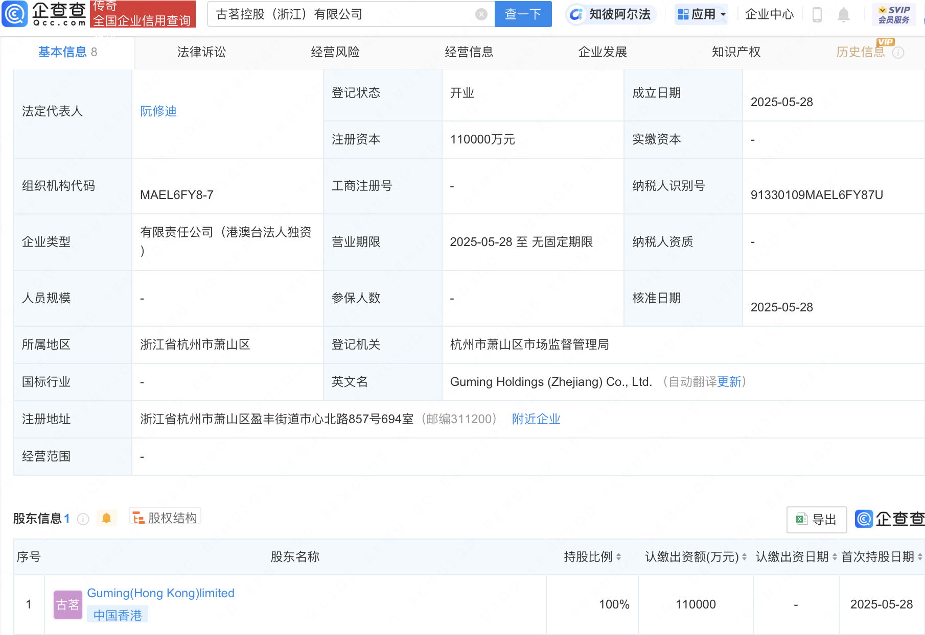 企查查APP显示,近日,古茗控股(浙江)有限公司成立,法定代表人为阮修迪,注册资本11亿人民币,经营范围包括控股公司服务、机械设备研发、软件开发、企业管理等。企查查股权穿透显示,该公司由古茗关联公司Guming(Hong Kong)Limited全资持股。