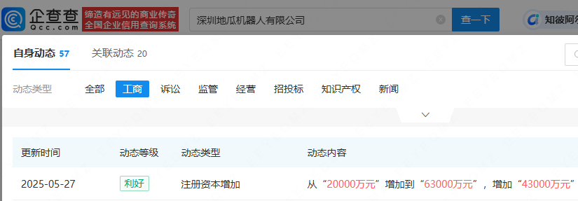 企查查APP显示,近日,深圳地瓜机器人有限公司发生工商变更,注册资本由2亿人民币增至6.3亿人民币,增幅215%。