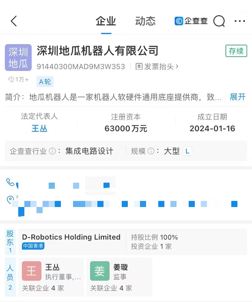 企查查显示,深圳地瓜机器人有限公司成立于2024年1月,法定代表人为王丛,由D-RoboticsHoldingLimited全资持股。公开信息显示,地瓜机器人由自动驾驶芯片公司地平线机器人事业部分拆组建,专注于消费级机器人底层计算平台的研发。
