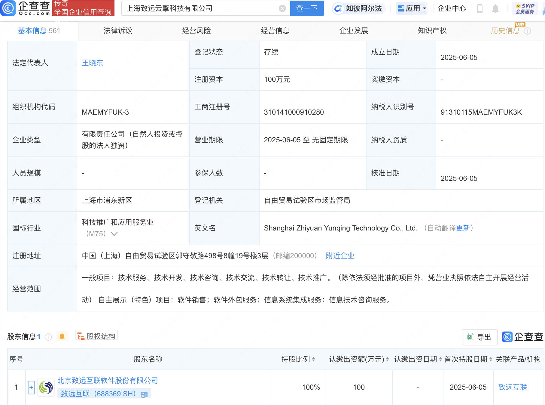 企查查APP显示,近日,上海致远云擎科技有限公司成立,法定代表人为王晓东,经营范围包含:软件销售;软件外包服务;信息系统集成服务;信息技术咨询服务等。企查查股权穿透显示,该公司由致远互联(688369)全资持股。