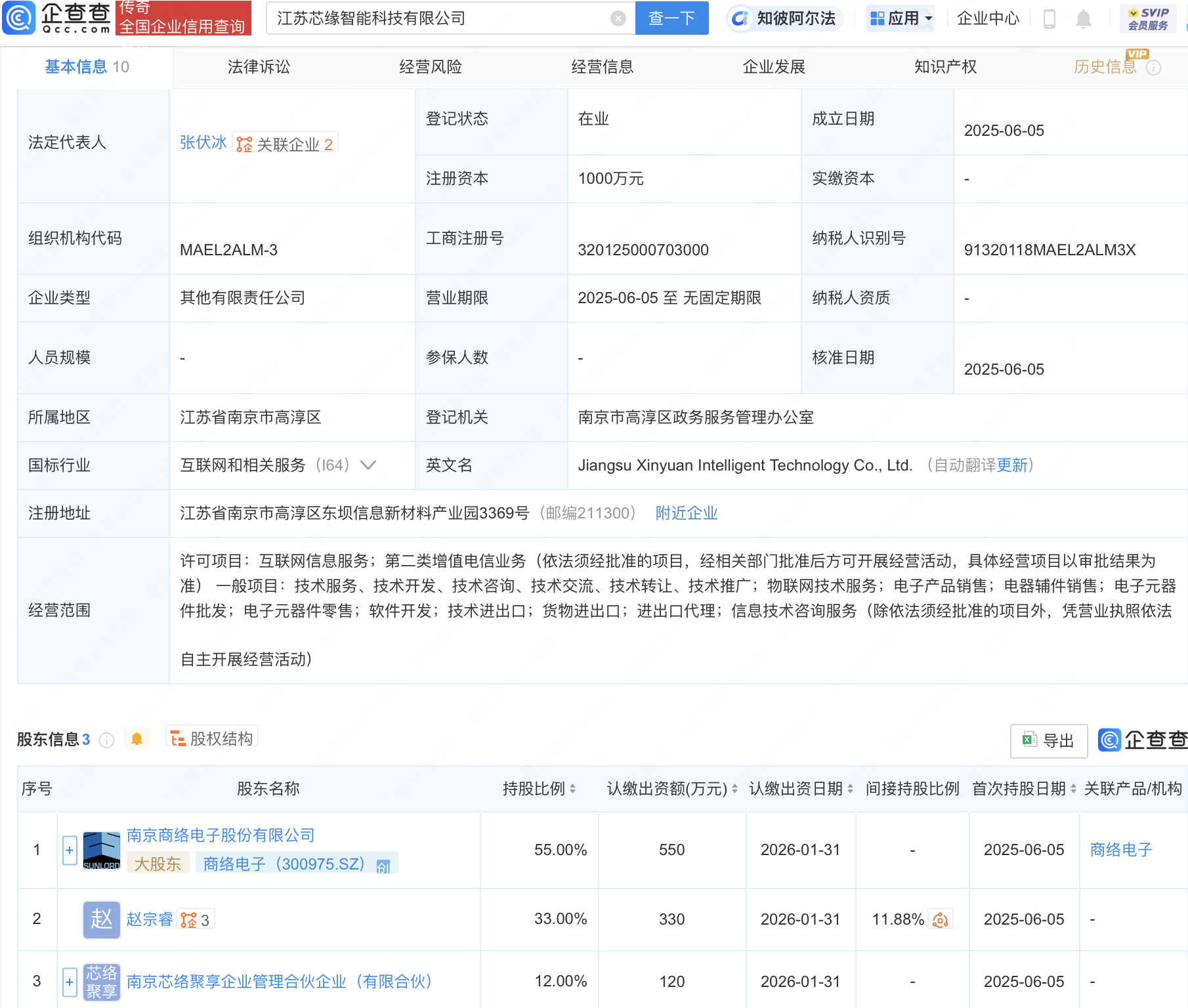 企查查APP显示,近日,江苏芯缘智能科技有限公司成立,法定代表人为张伏冰,经营范围包含:物联网技术服务;电子产品销售;电器辅件销售;电子元器件批发等。企查查股权穿透显示,该公司由商络电子(300975)等共同持股。