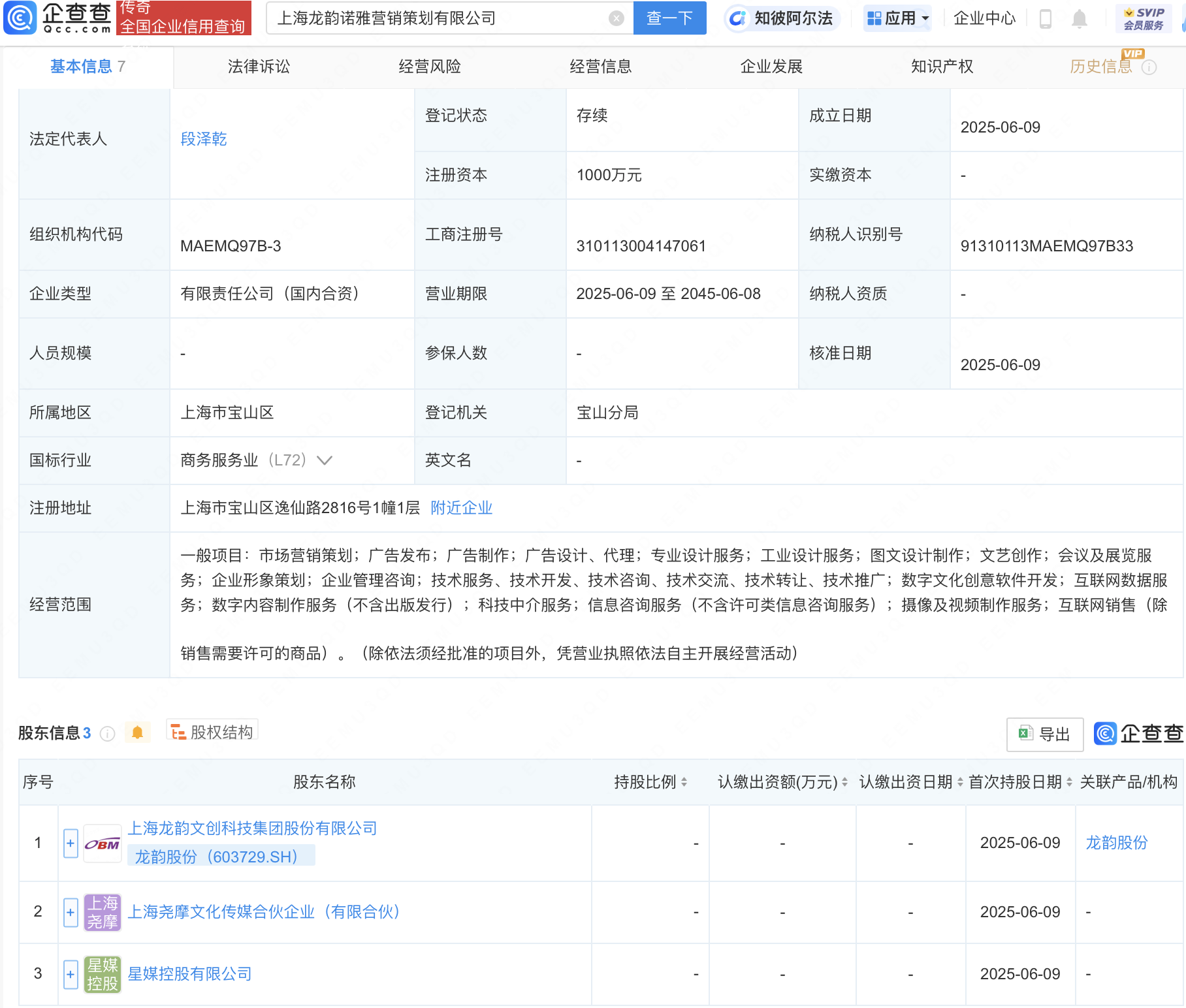 企查查APP显示,近日,上海龙韵诺雅营销策划有限公司成立,法定代表人为段泽乾,经营范围包含:数字文化创意软件开发;互联网数据服务;数字内容制作服务(不含出版发行)等。企查查股权穿透显示,该公司由龙韵股份(603729)等共同持股。