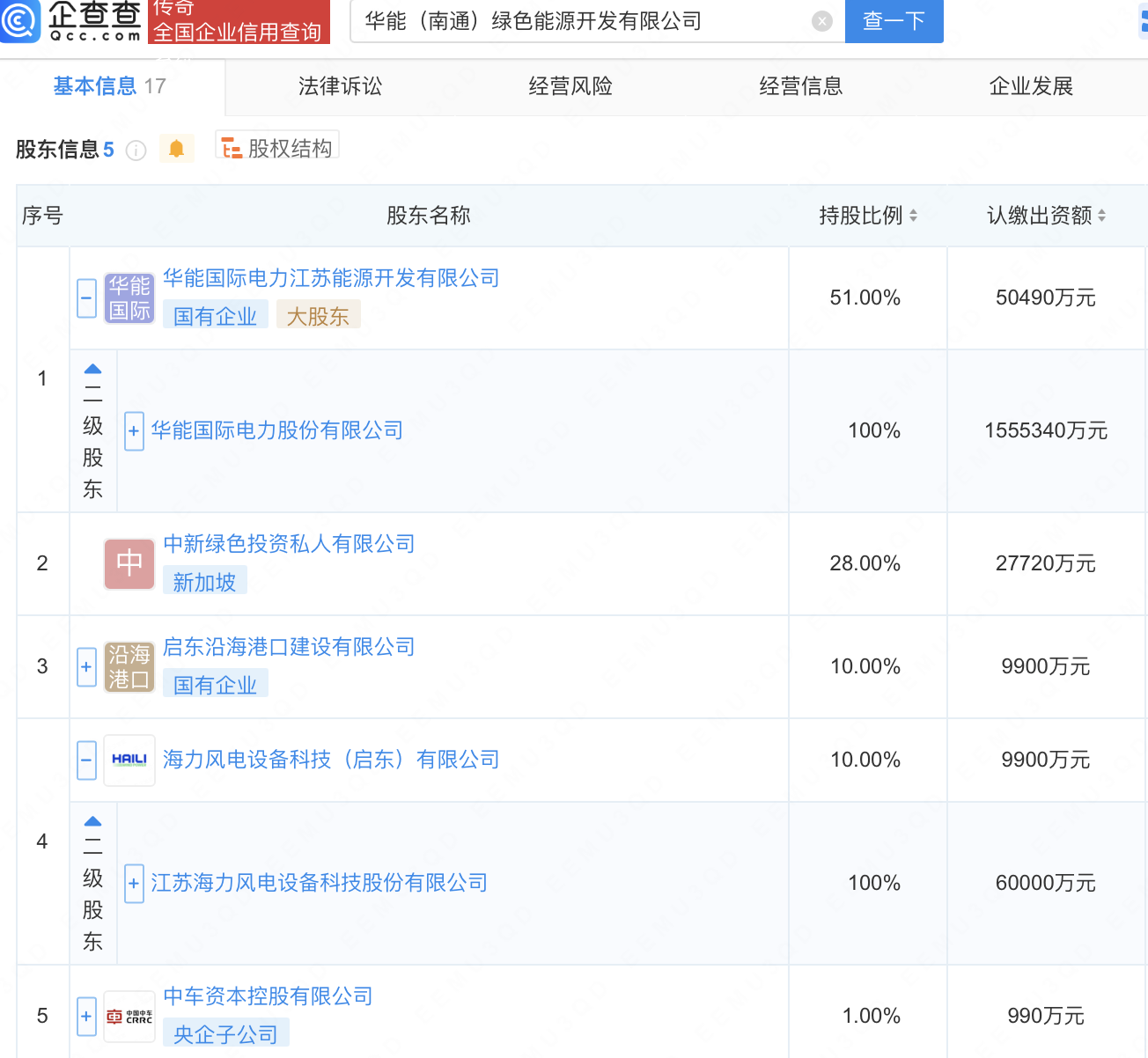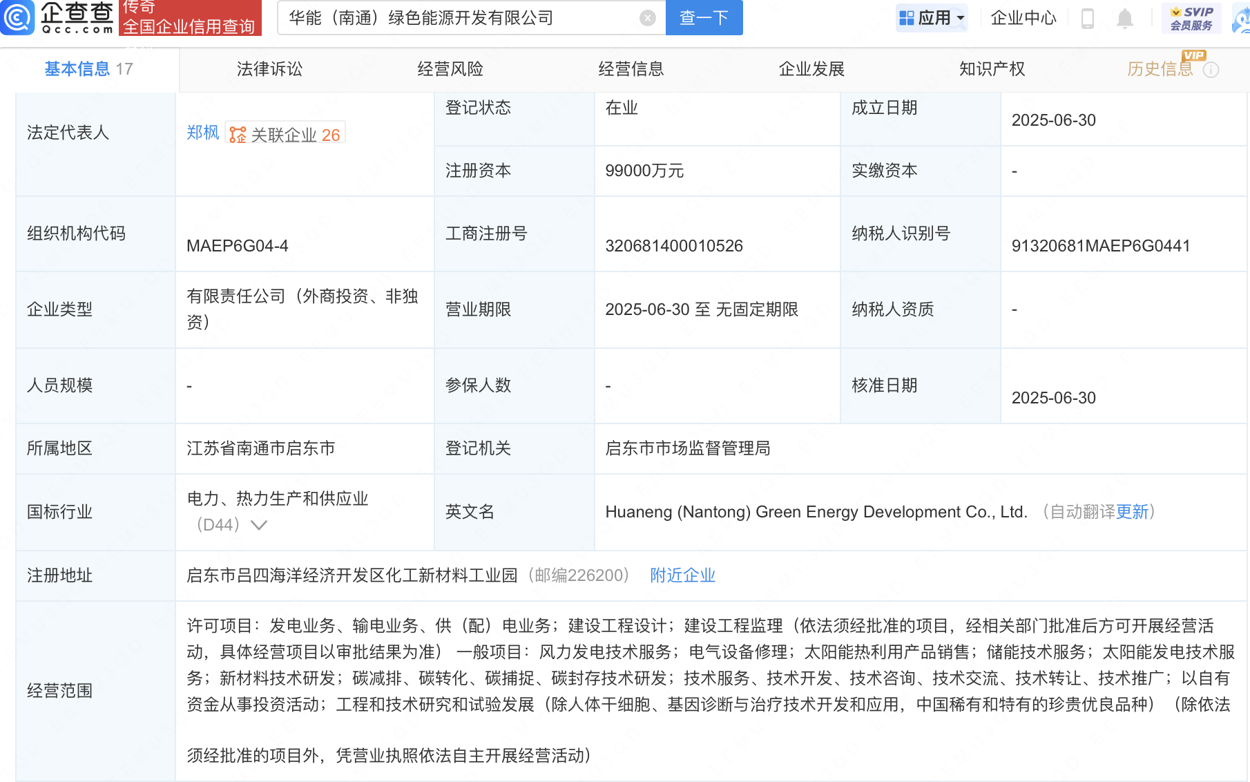 企查查APP显示,近日,华能(南通)绿色能源开发有限公司成立,注册资本9.9亿元,经营范围包含:太阳能热利用产品销售;储能技术服务;太阳能发电技术服务;新材料技术研发等。企查查股权穿透显示,该公司由华能国际(600011)全资子公司华能国际电力江苏能源开发有限公司、海力风电(301155)全资子公司海力风电设备科技(启东)有限公司等共同持股。
