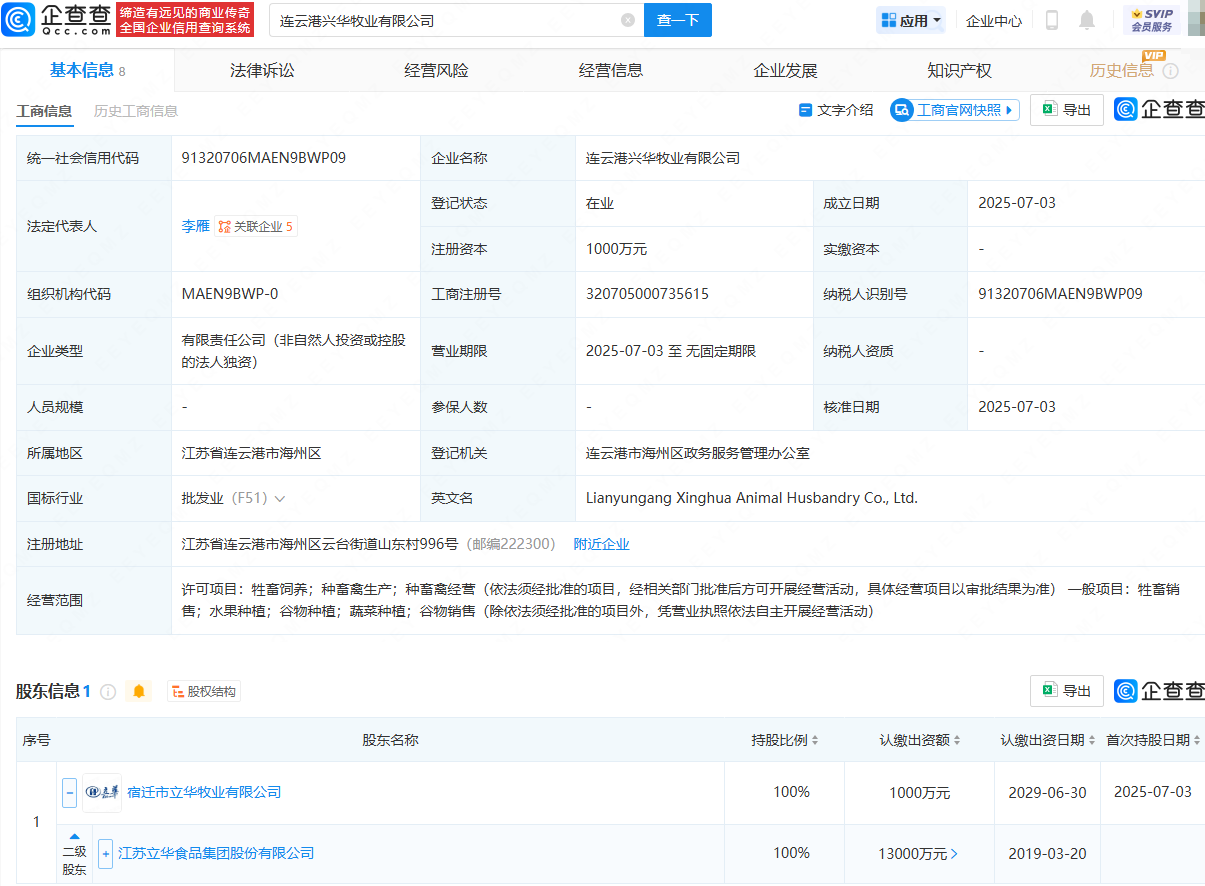 企查查APP显示,近日,连云港兴华牧业有限公司成立,法定代表人为李雁,注册资本为1000万元,经营范围包含:牲畜饲养;种畜禽生产;种畜禽经营;牲畜销售;水果种植;谷物种植;蔬菜种植;谷物销售。企查查股权穿透显示,该公司由立华股份(300761)间接全资持股。
