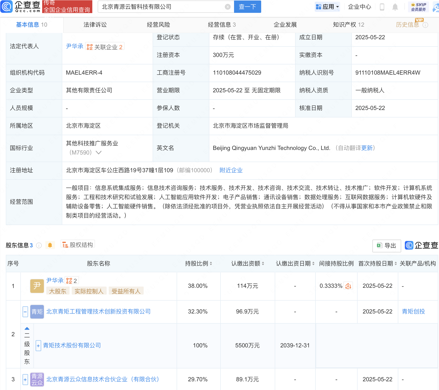 企查查APP显示,北京青源云智科技有限公司成立,法定代表人为尹华承,经营范围包含:人工智能应用软件开发;电子产品销售;通讯设备销售;人工智能硬件销售等。企查查股权穿透显示,该公司由青矩技术(836208)全资子公司北京青矩工程管理技术创新投资有限公司等共同持股。
